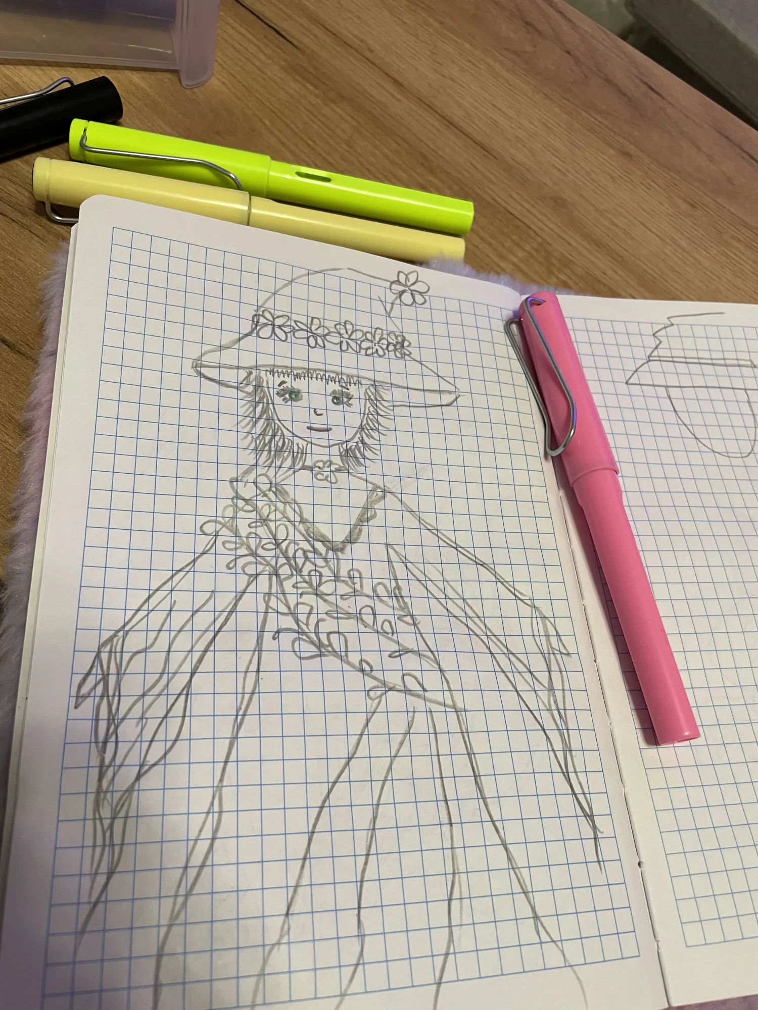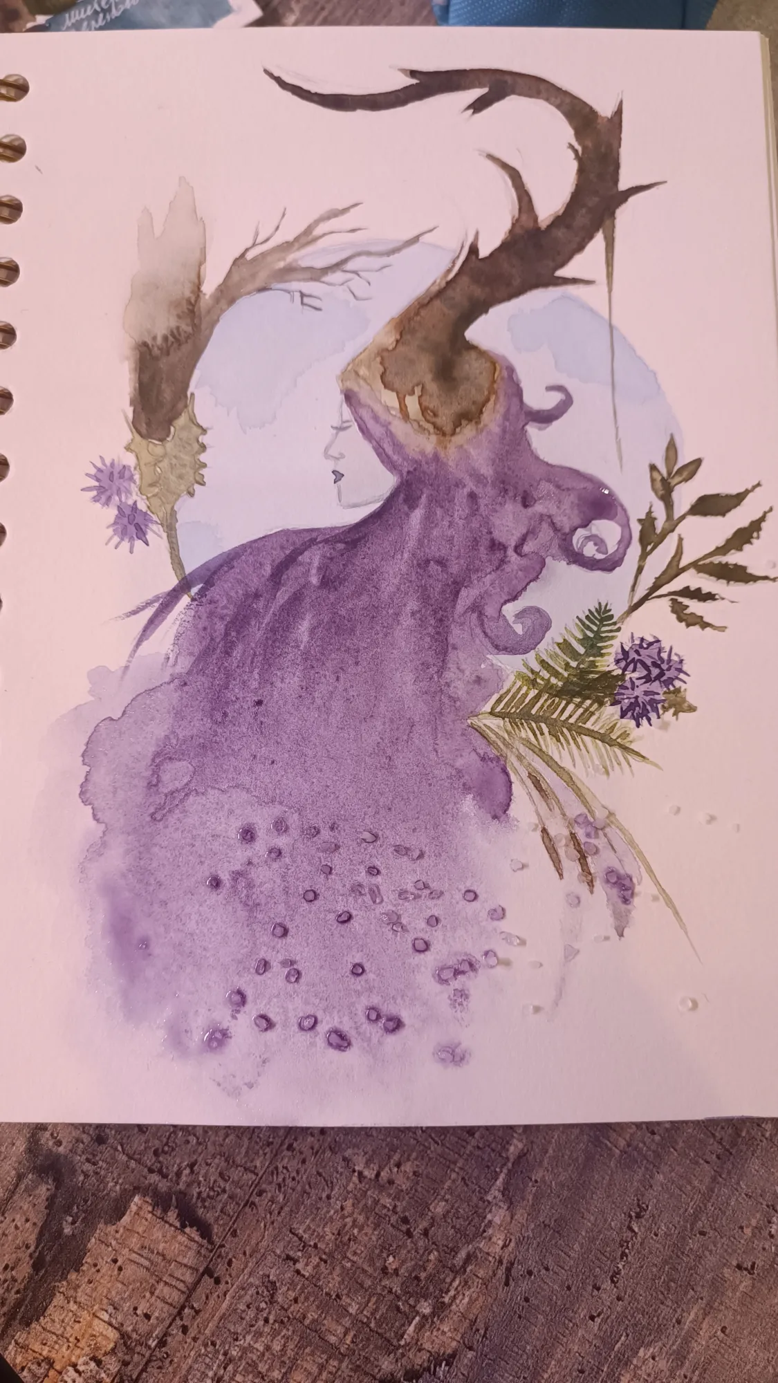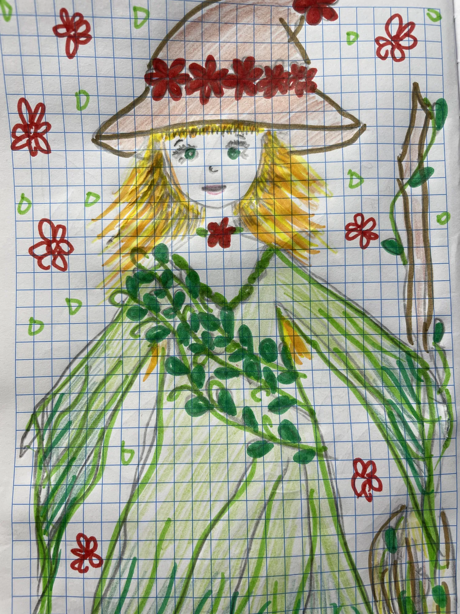 Последние детали. Волосы — коричневая краска, лёгкие штрихи. Глаза — чёрные точки. Рот — тонкая линия улыбки.