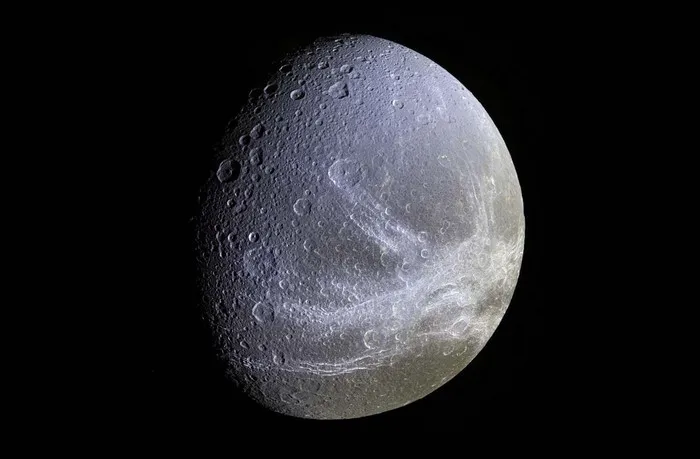 Диона — четвертый по величине спутник Сатурна со средним диаметром 1 123 километра, состоящий преимущественно из водяного льда. Снимок был сделан 21 июня 2015 года космическим аппаратом NASA "Кассини".