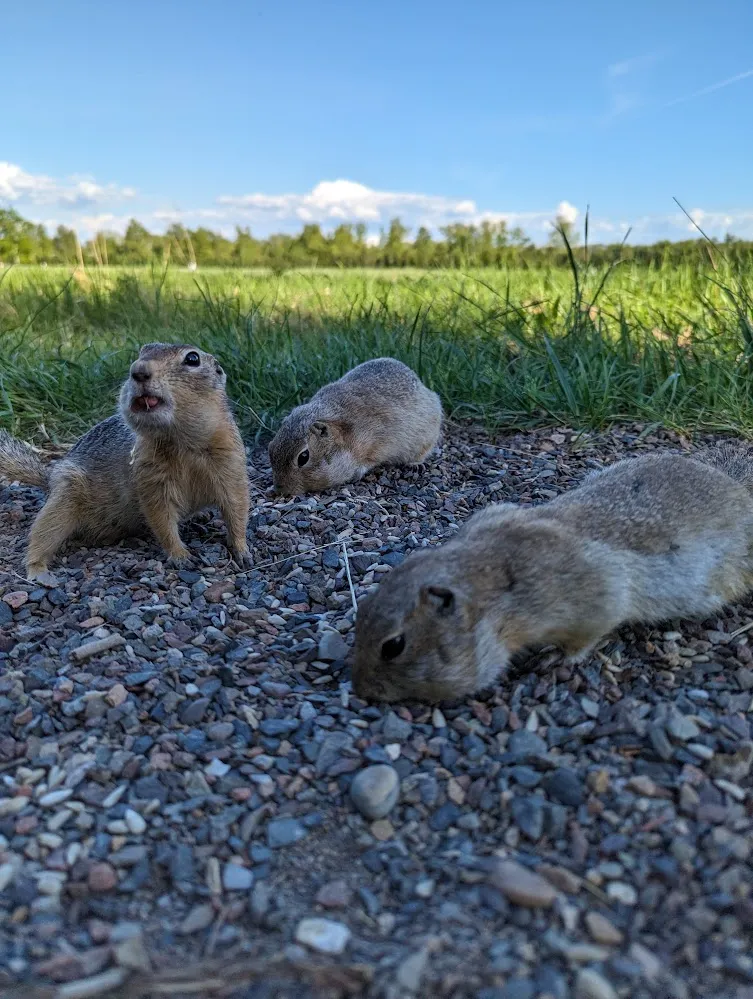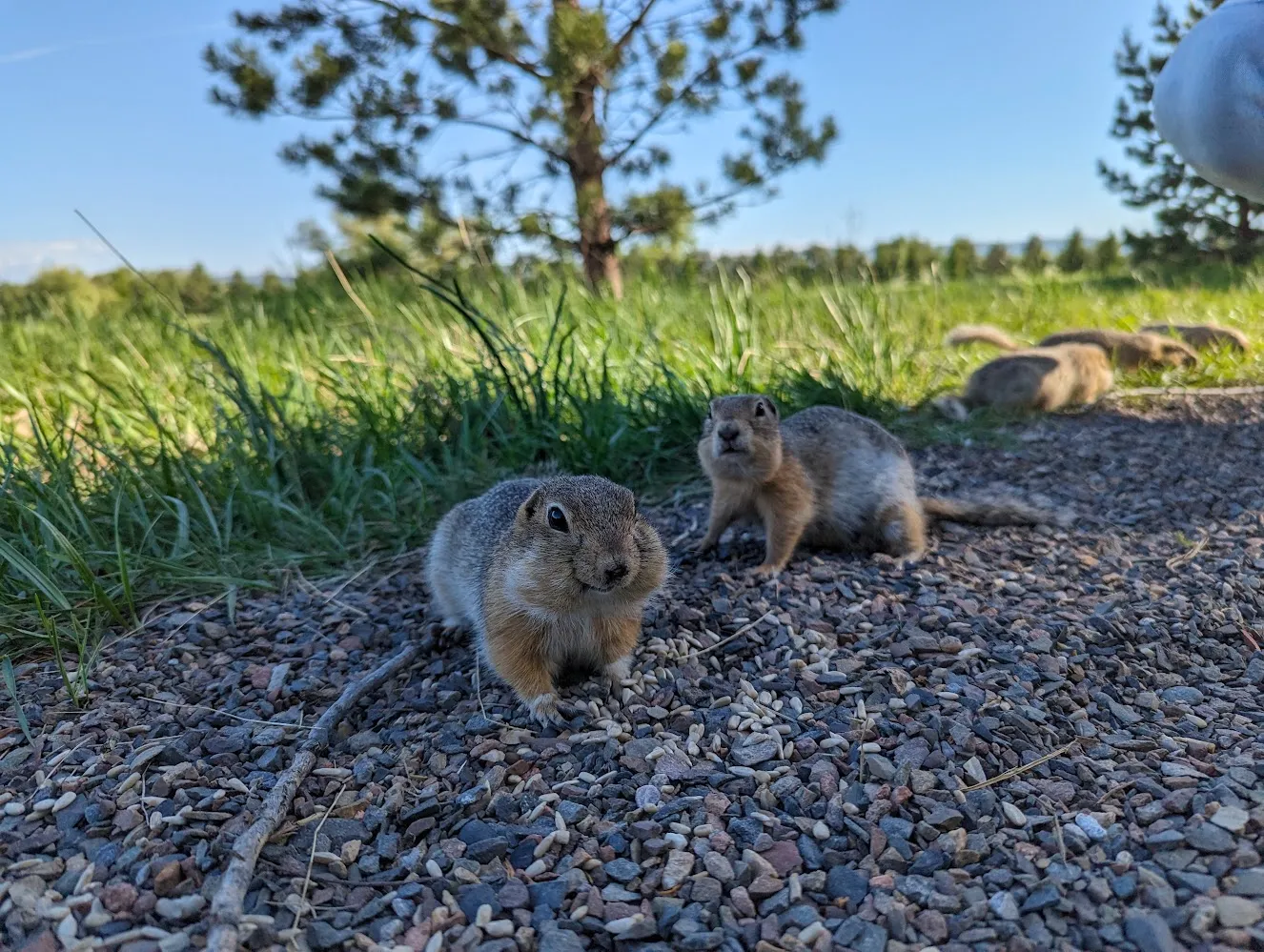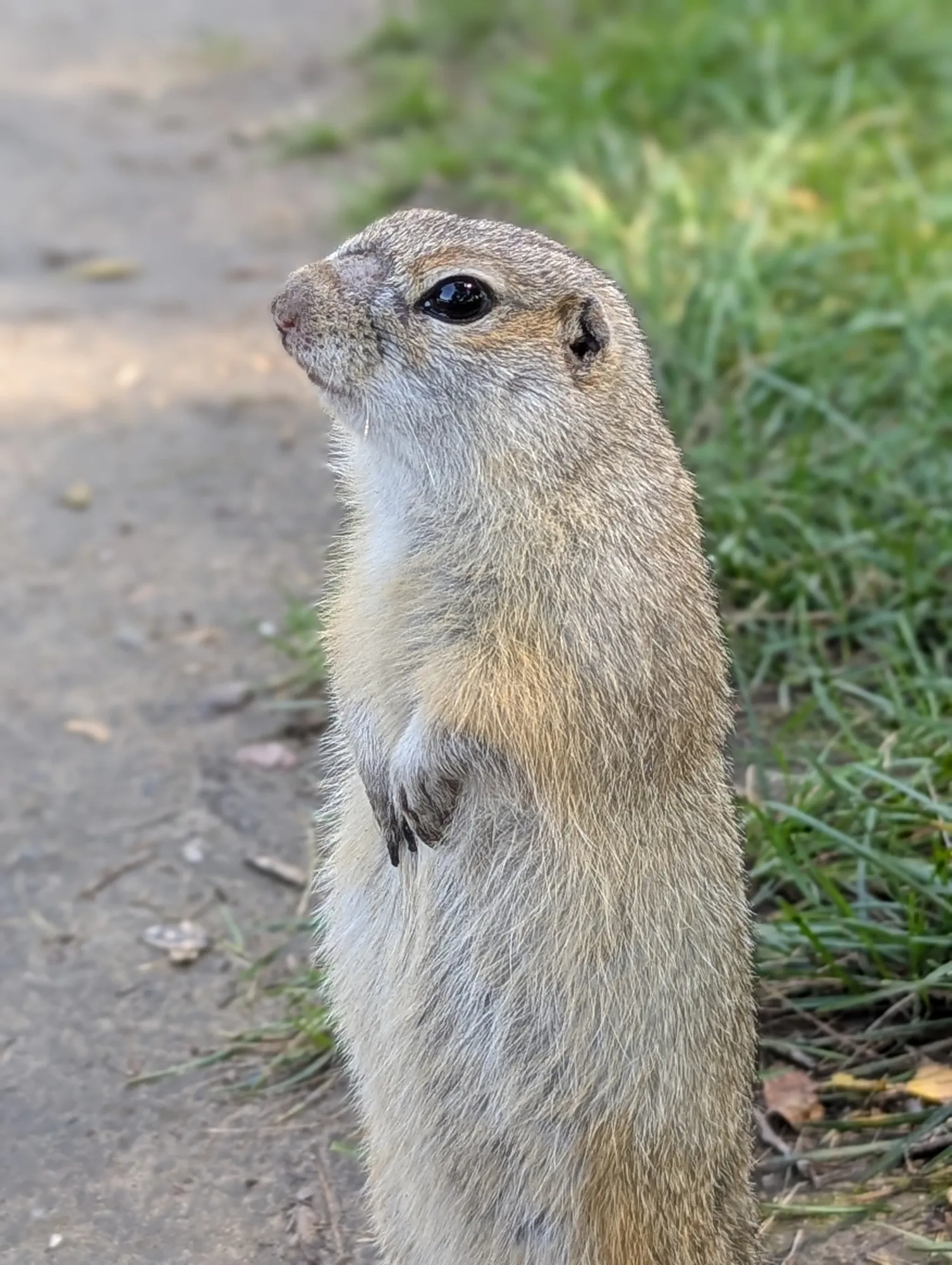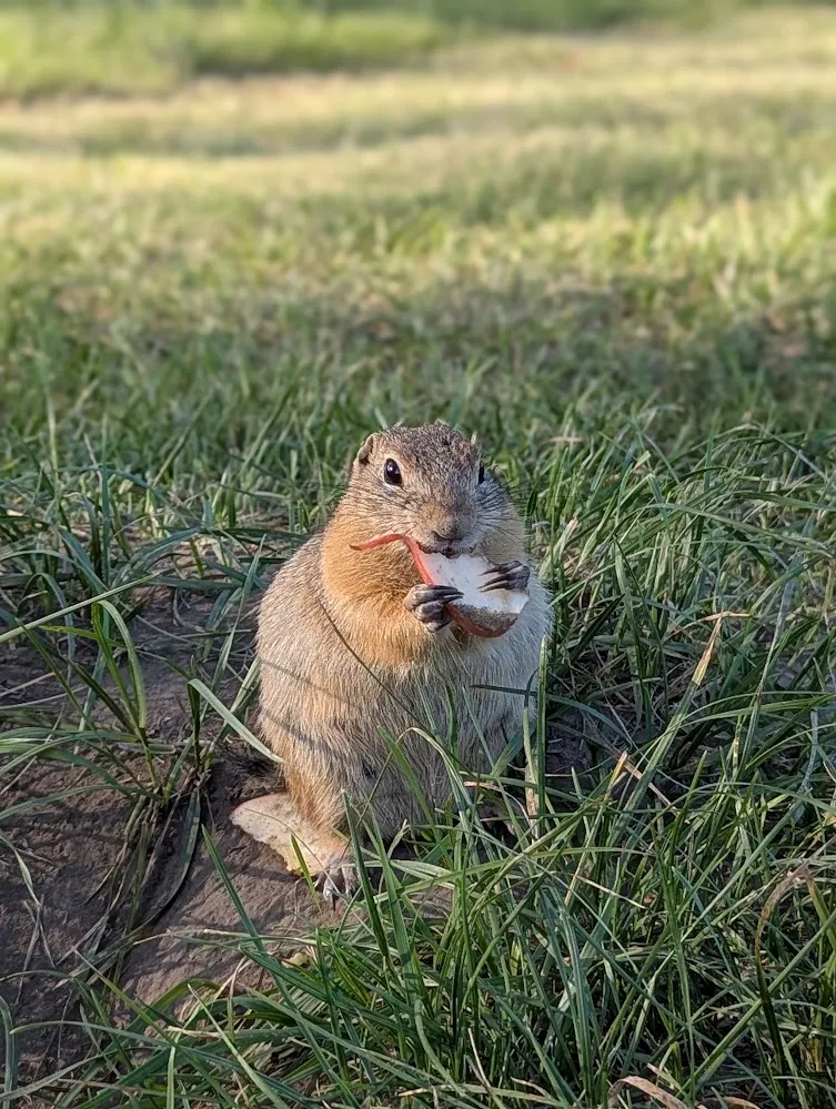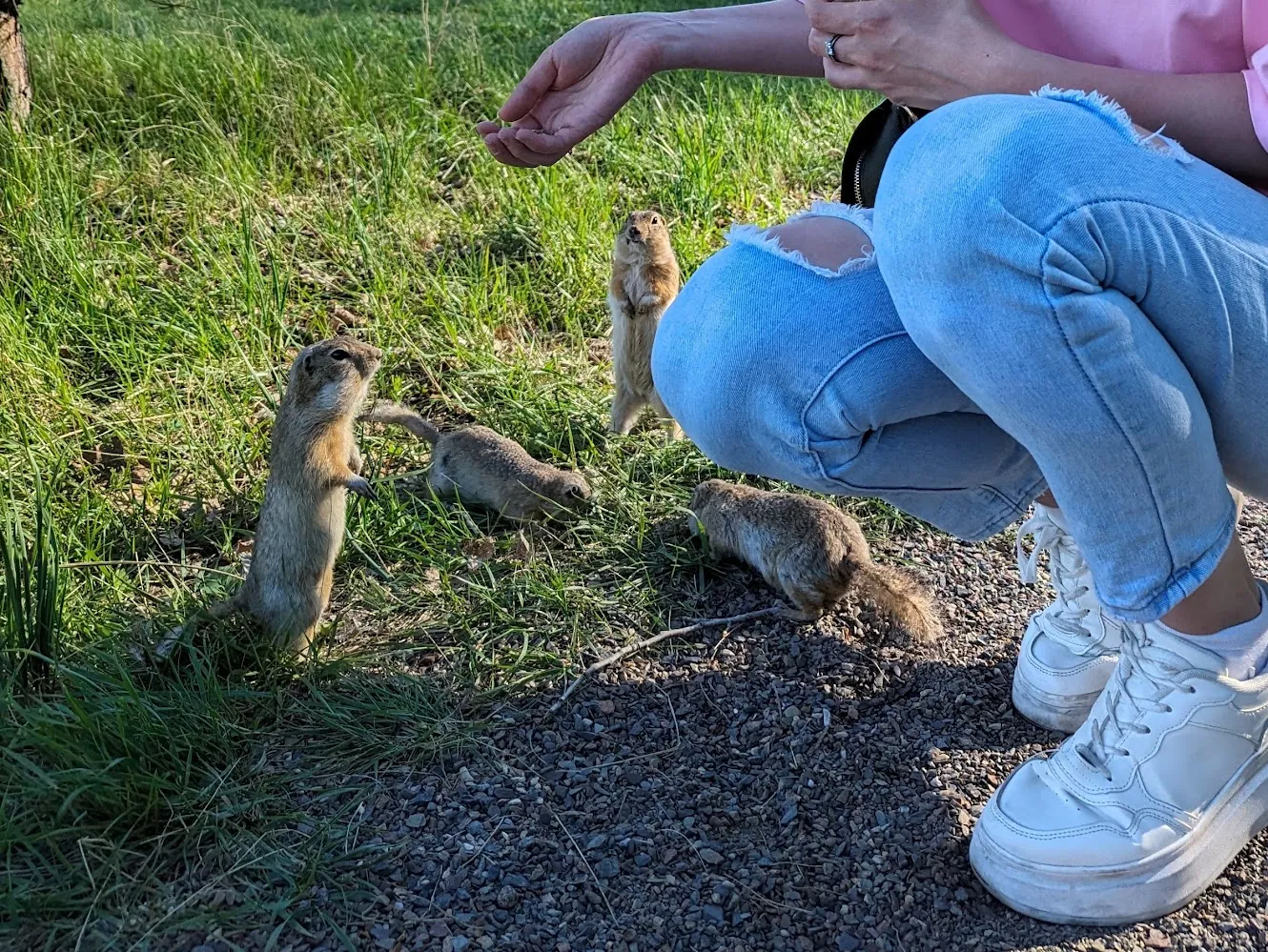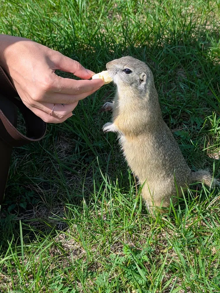 Если весной суслы ещё довольно робкие и пугливые, то летом они превращаются в настоящих разбойников. Если ты пришёл с угощением, то тебя обязательно облепит целая стайка голодных грызунов.