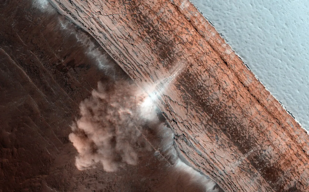 На нескольких фото зафиксированы результаты оползней, в основном они происходят под влиянием сезонного потепления. Конечно они не из снега, а из двуокиси углерода.