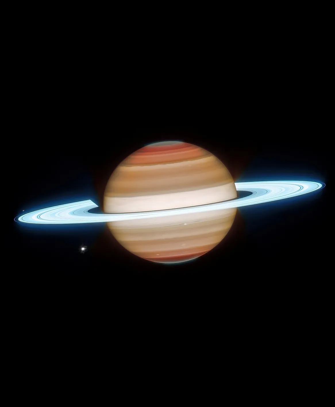 В инфракрасном диапазоне кольца Сатурна выглядят особенно яркими благодаря высокому содержанию отражающего водяного льда. Эти частицы эффективно рассеивают солнечный свет, создавая эффект «неонового свечения».