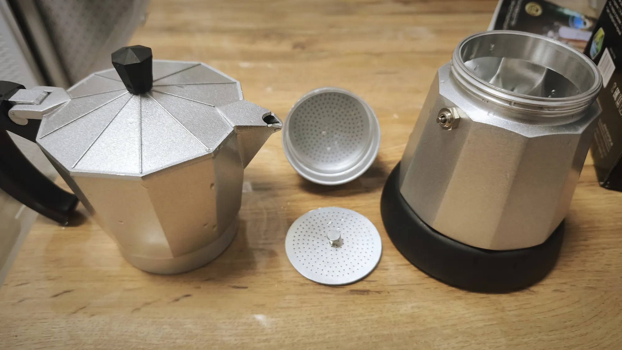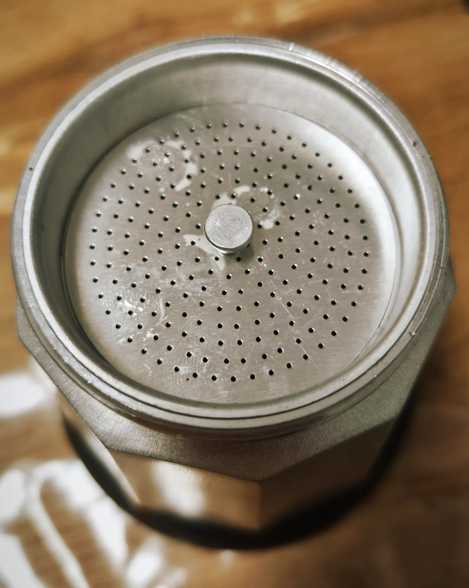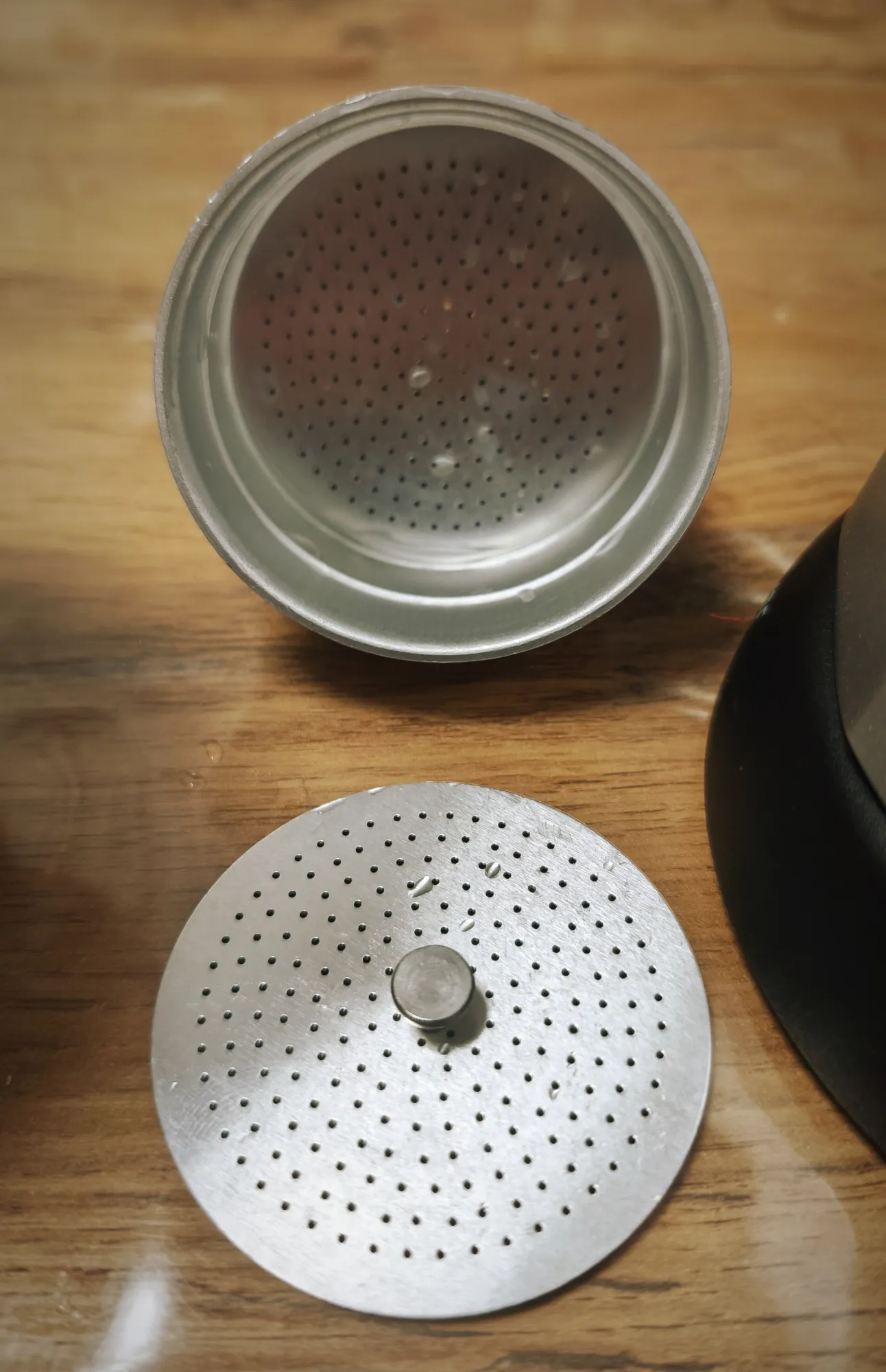 В отличие от обычной кофеварки в дно электро гейзерной встроен термоэлемент, который устанавливается на поддон как у обычного электрочайника. Порадовало наличие дополнительного разделительного ситечка для тех кто не любит крепкий кофе. Я такой аддон вижу впервые. Классная штука.