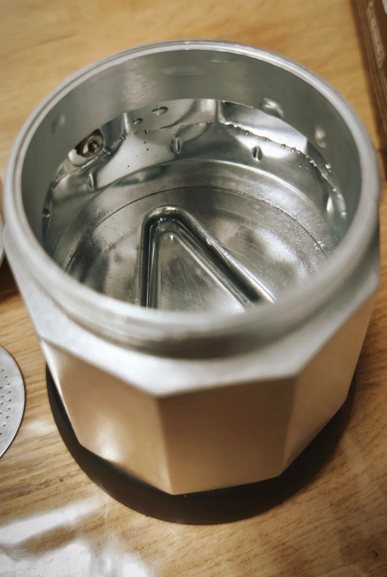 Сразу видно отличие от стандартных гейзерной кофеварки: треугольный термоэлемент впаянный в дно.