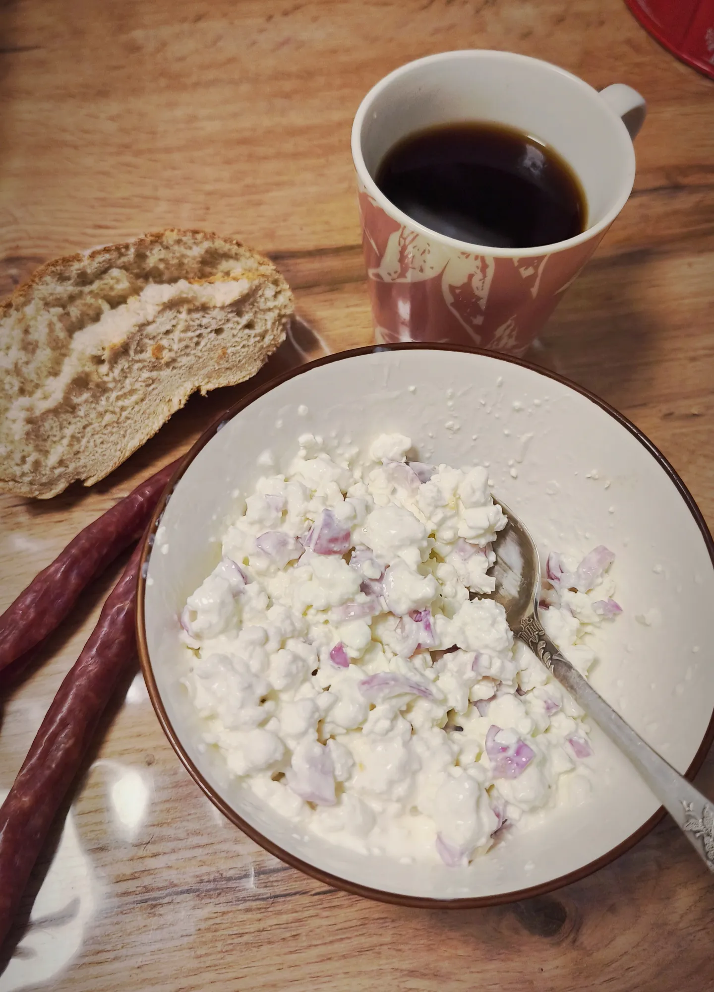 готовим лёгкий ужин в виде творога с луком, вприкуску с кабаносами из индейки и гречневым хлебом. Наливаем кофе...