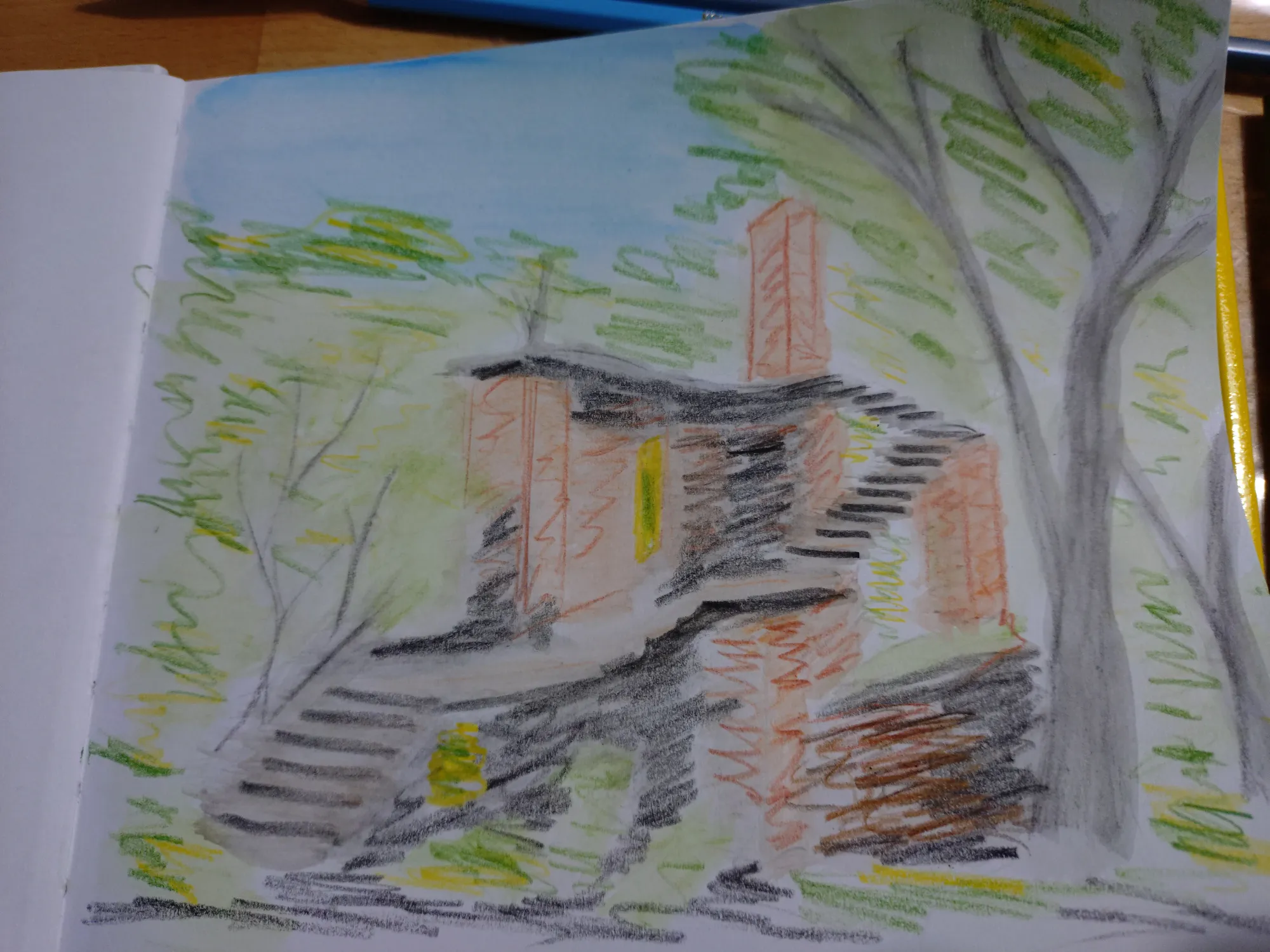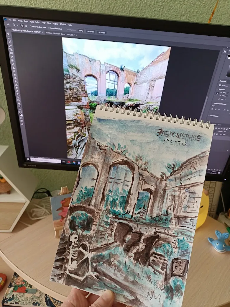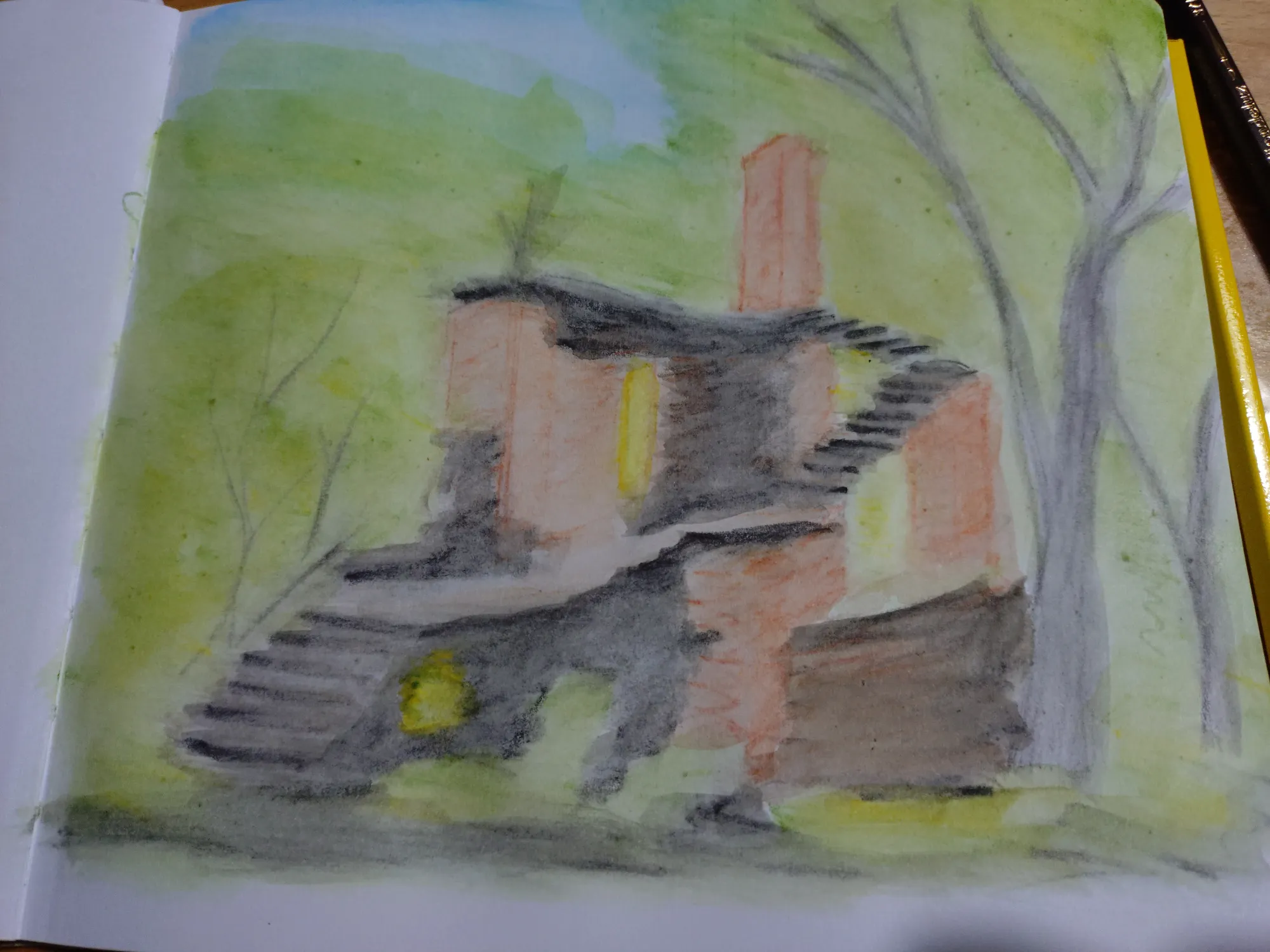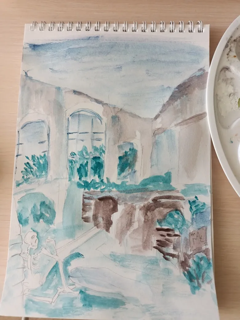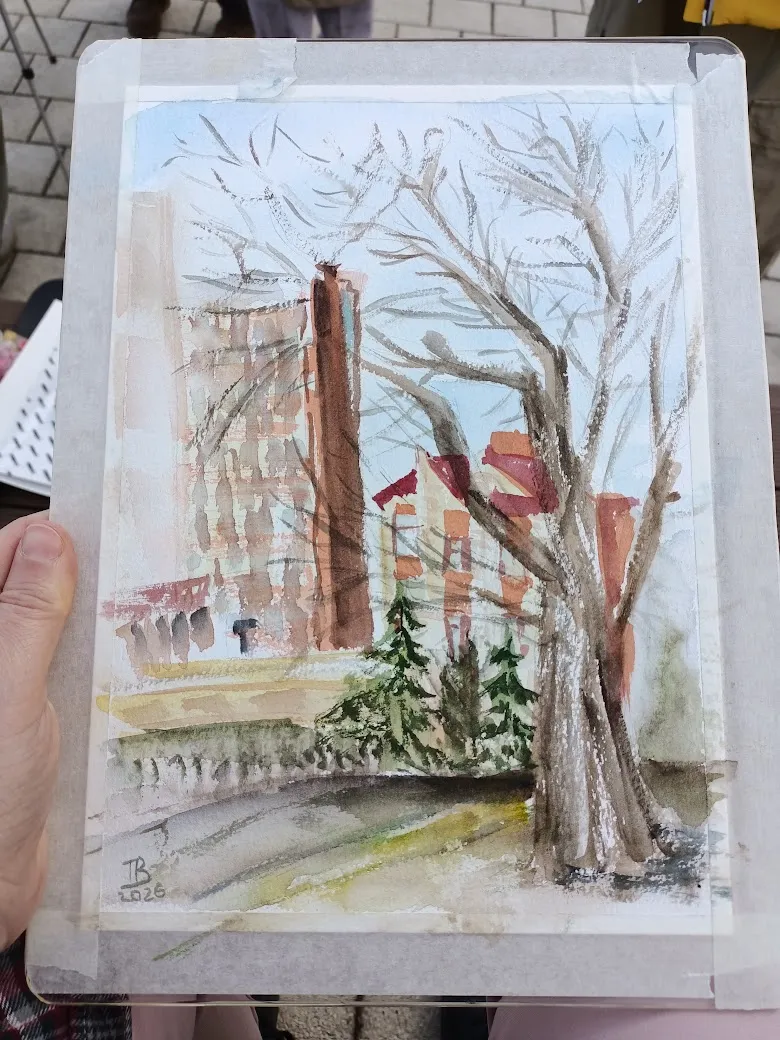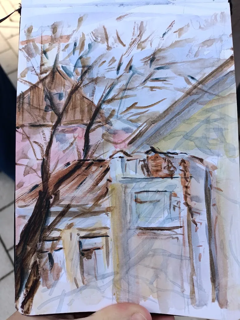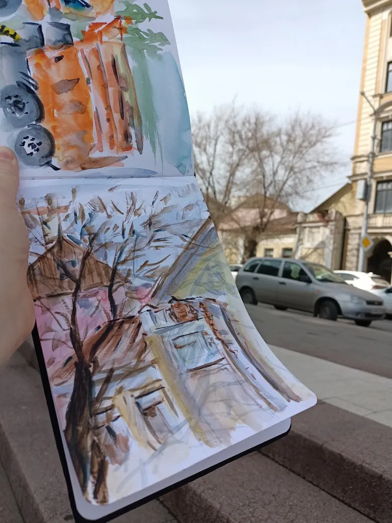 Пленэр получился совершенно бессистемным: пока остальные участницы группы рисовали один сюжет, я начала тоже с одного, правда не такого как у них, но потом вышло солнце, и я поняла, что надо рисовать то, на чём появились прикольные тени, а тот сюжет подождёт, там теней особо нет. Правда же тени прикольные?