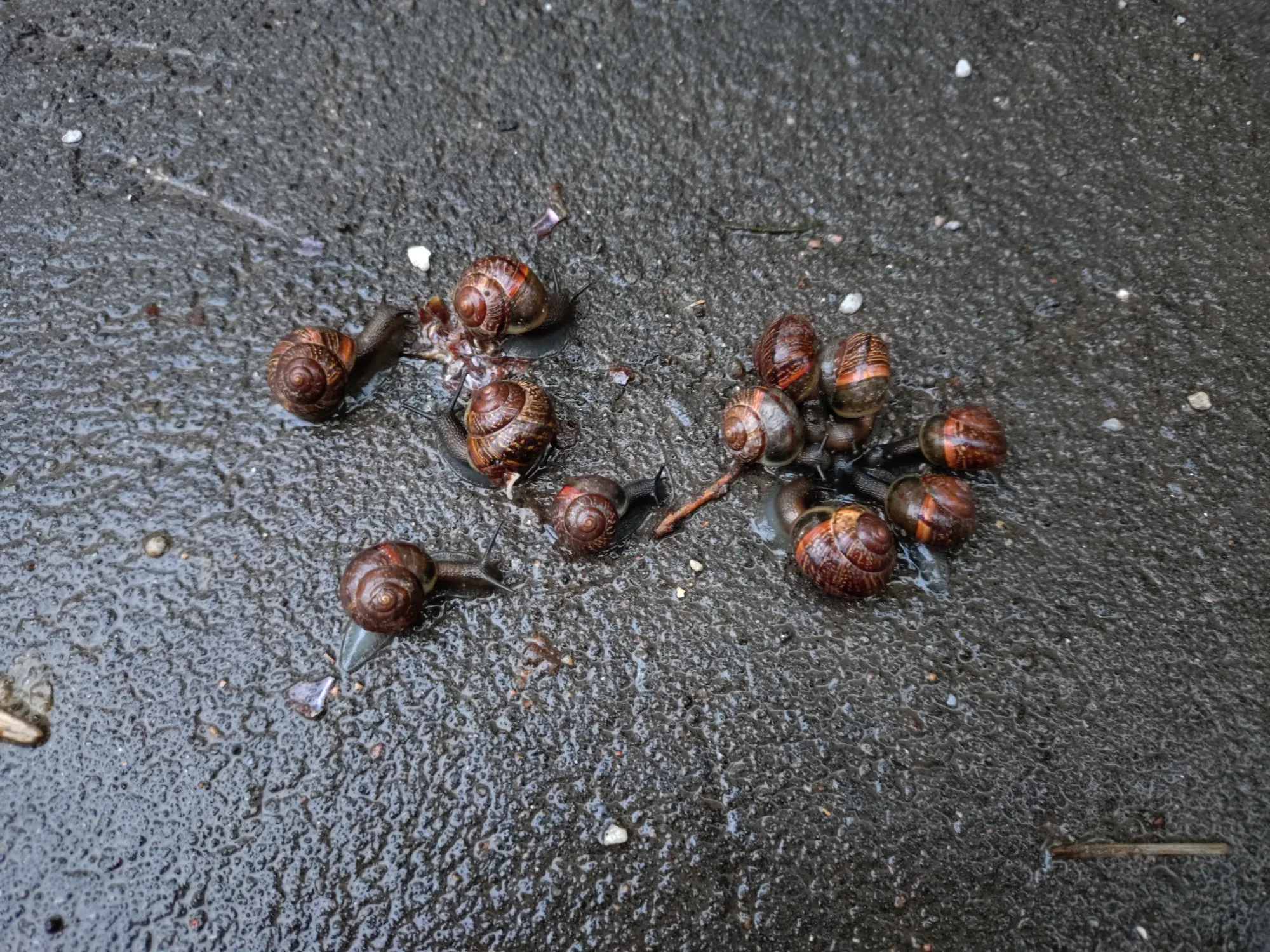Идет дождь, на асфальт тротуара выползают улиточки.