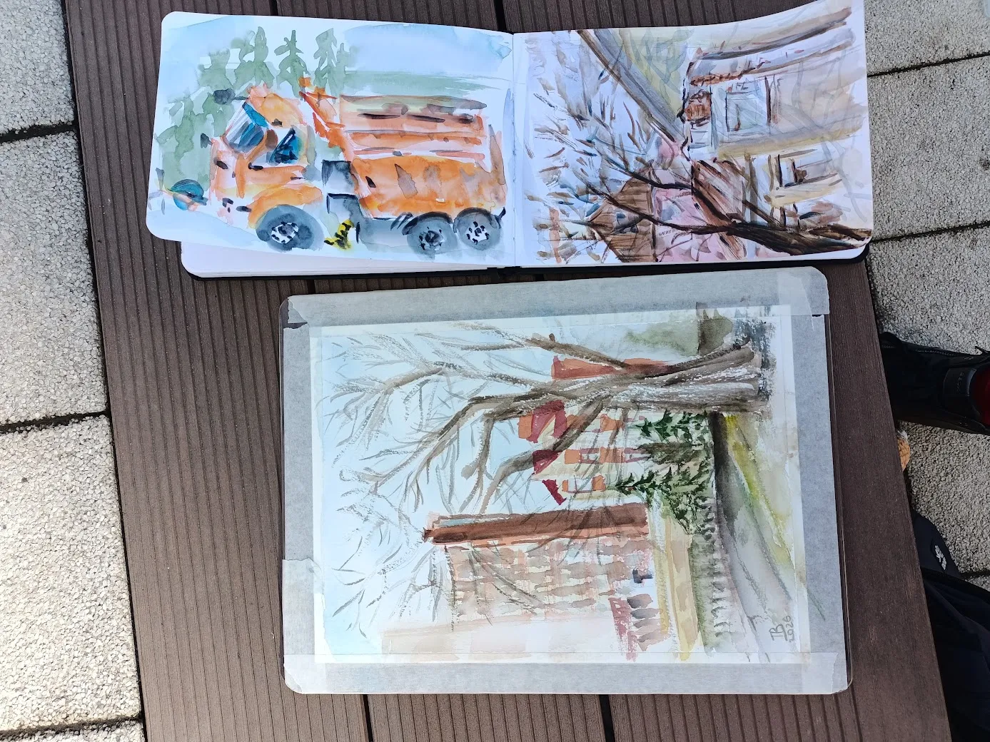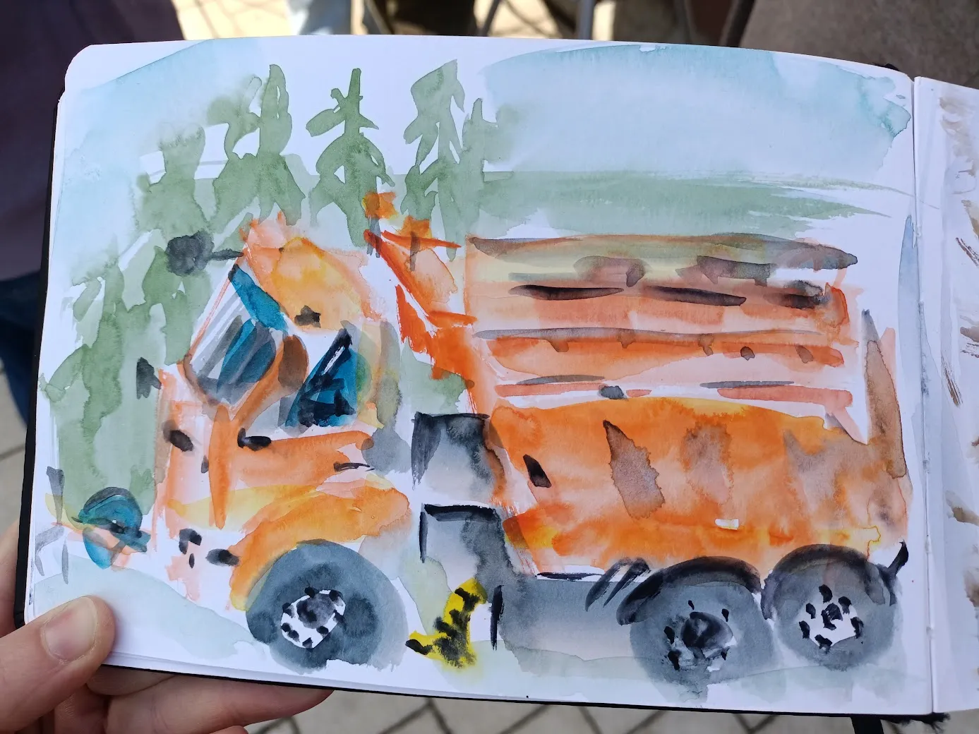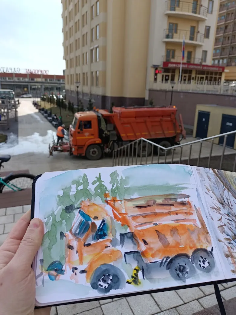 Но потом случилось событие: приехала поливать плитку благоустроительная машина, прекрасная своей оранжевостью, и пришлось всё бросить, чтобы рисовать её, пока не уехала. Без наброска конечно, на всё про всё минут 7 )