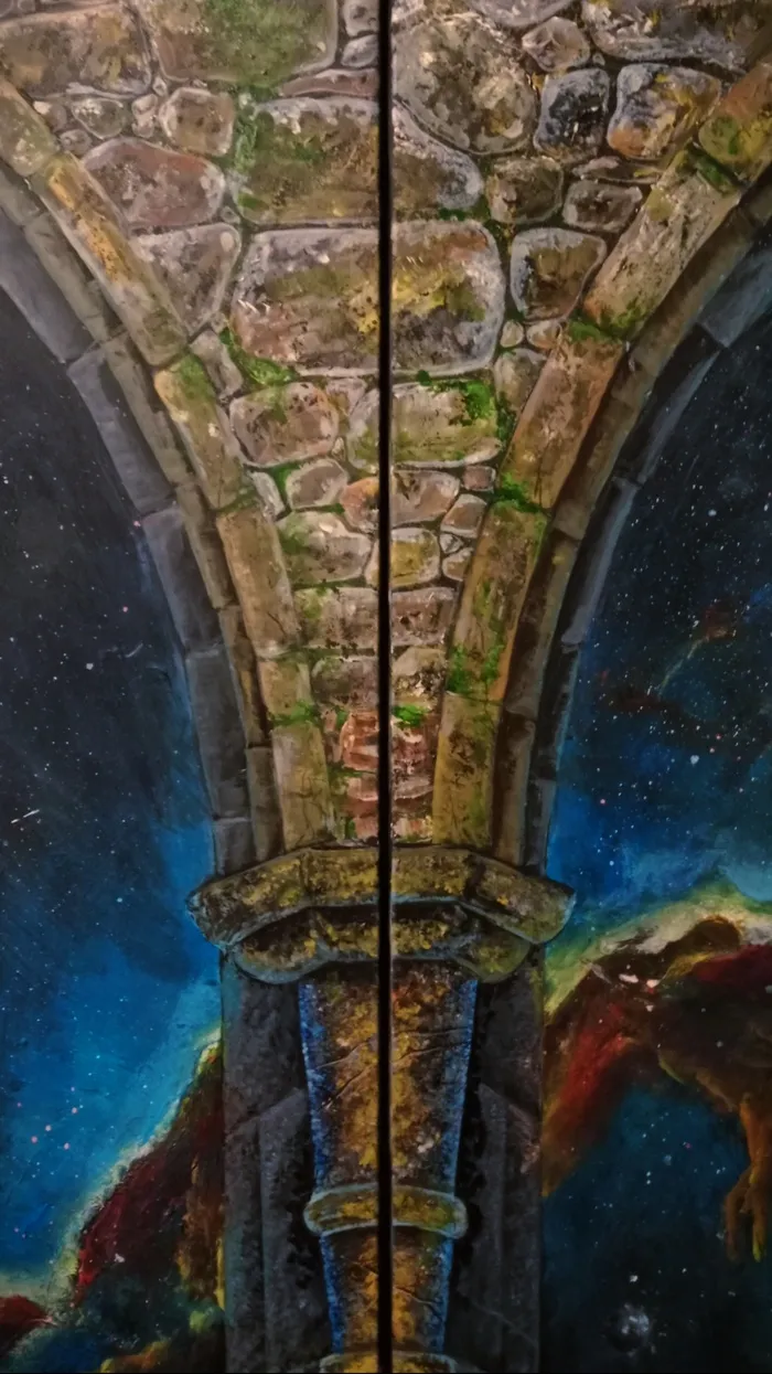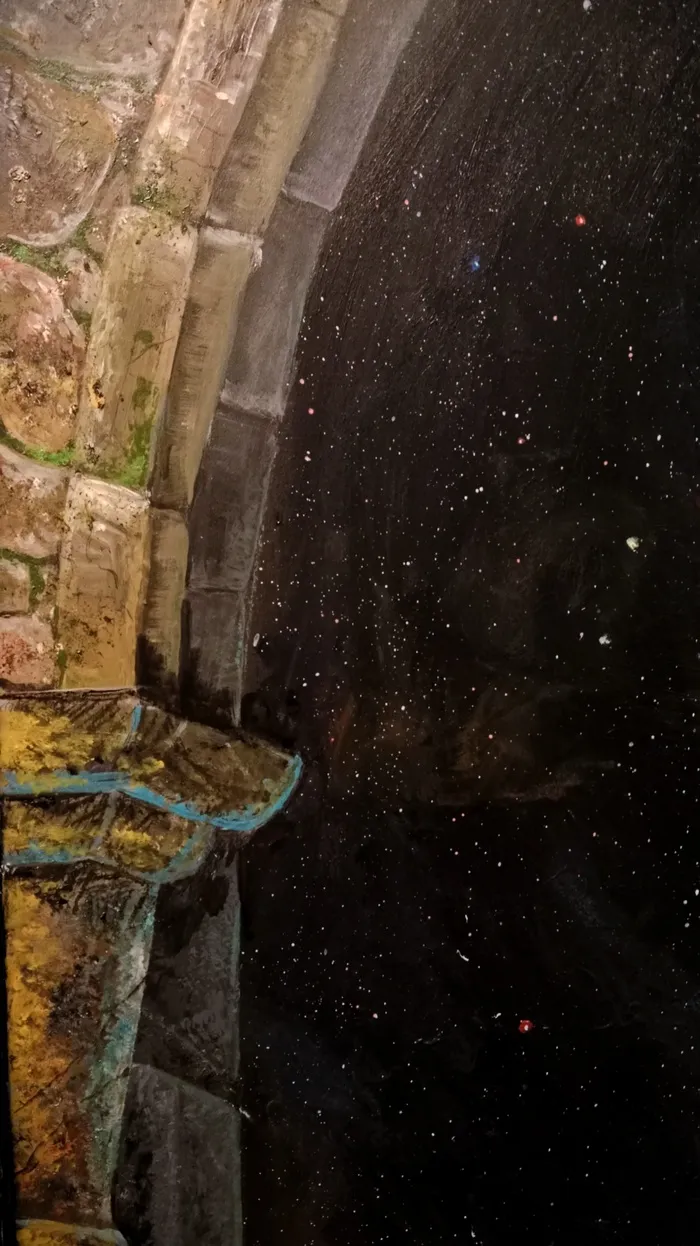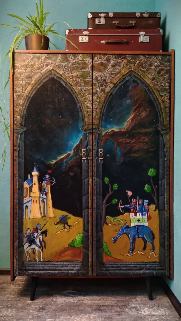 Морду шкафью в черный загрунтовали, бока в пролетарский серый покрасили - тут без изыска. На картинке решили поженить средневековую книжную миниатюру и космические снимки телескопов. А чё бы и нет? Рисовали акрилом. Можно было б и маслом, но эта история растянулась бы года на пол.
