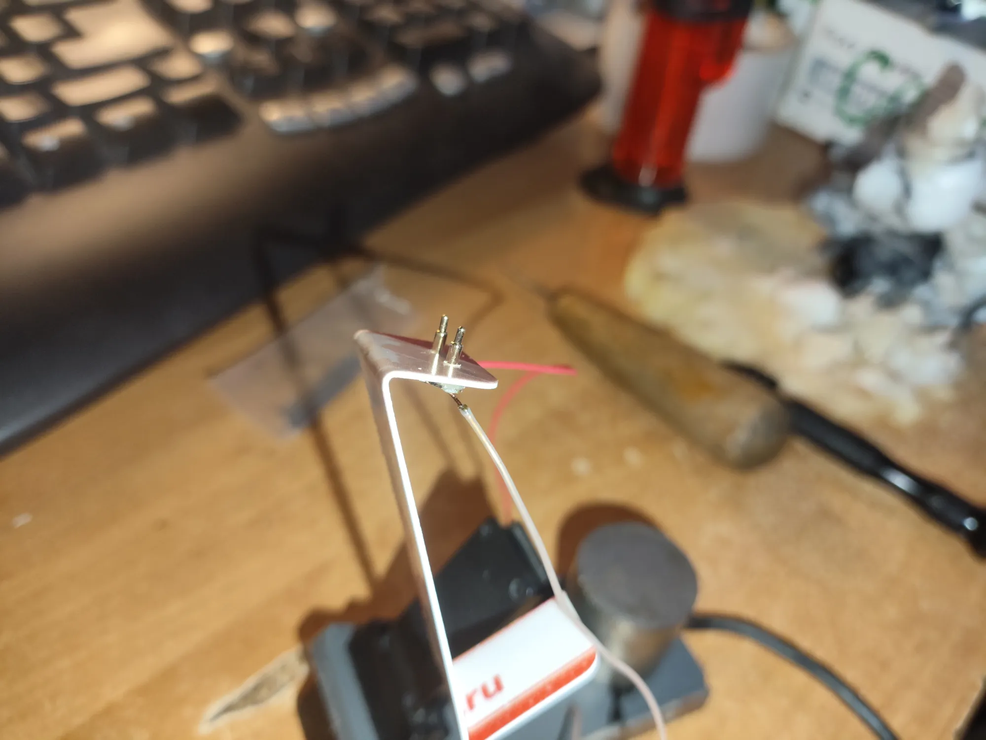 Приклеиваю и блямбу и загогулину к удлинителю двухсторонним скотчем: