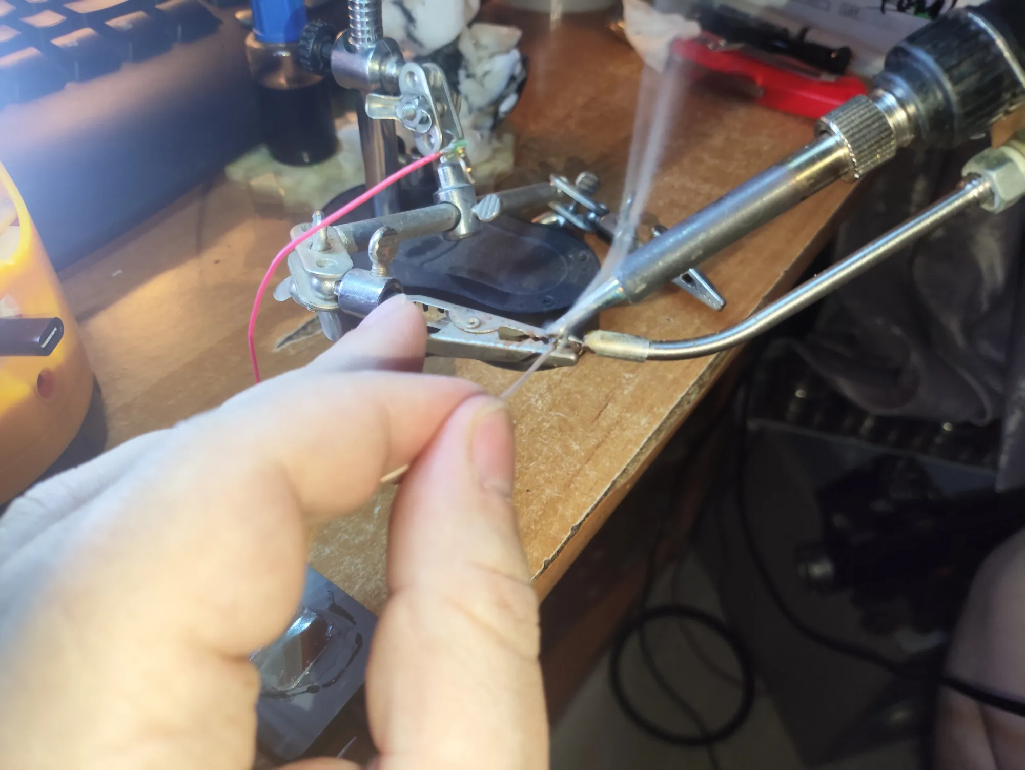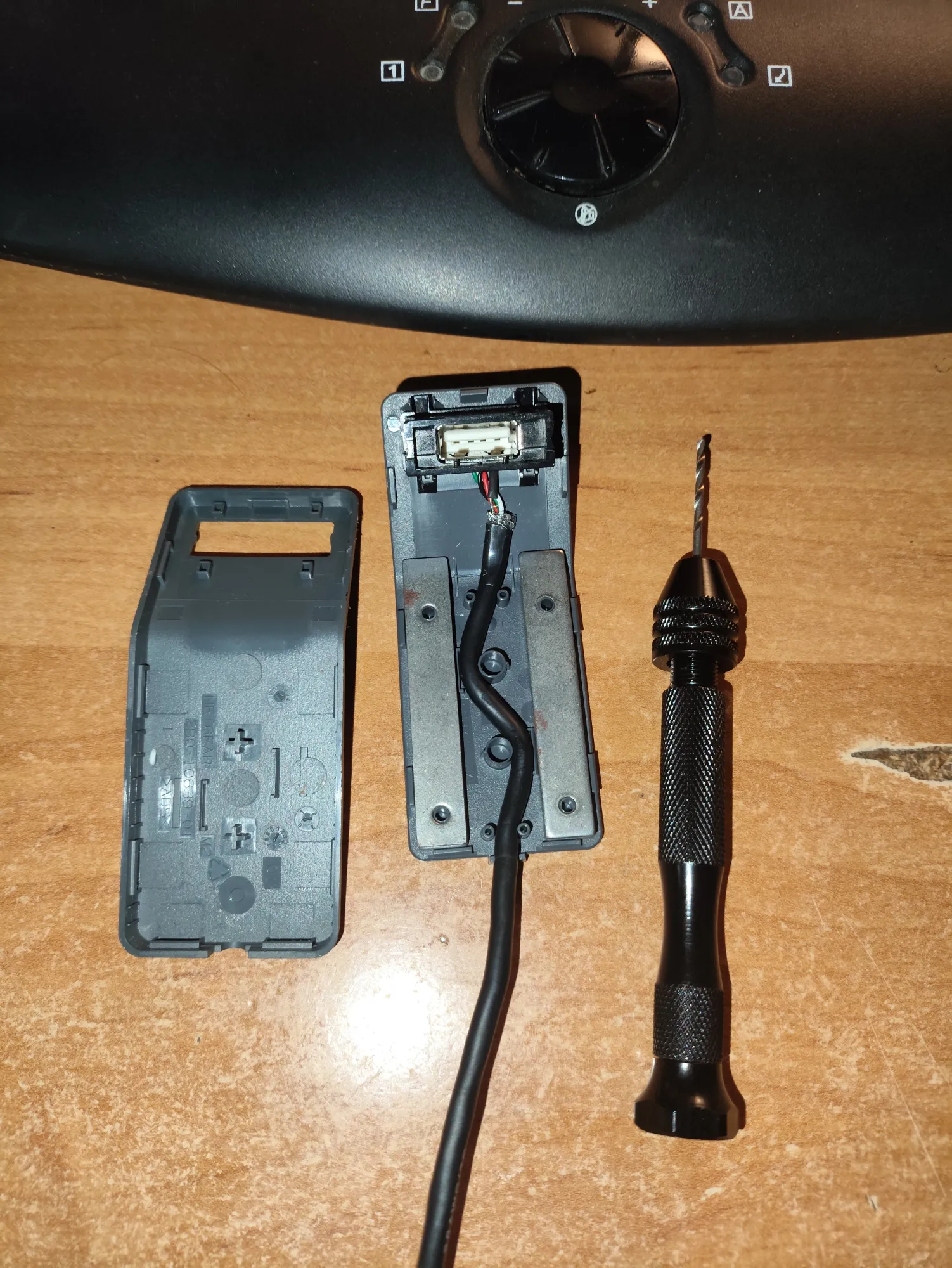 Режу чёрный и красный провода, идущие к USB, и подпаиваюсь к ним двумя дополнительными: