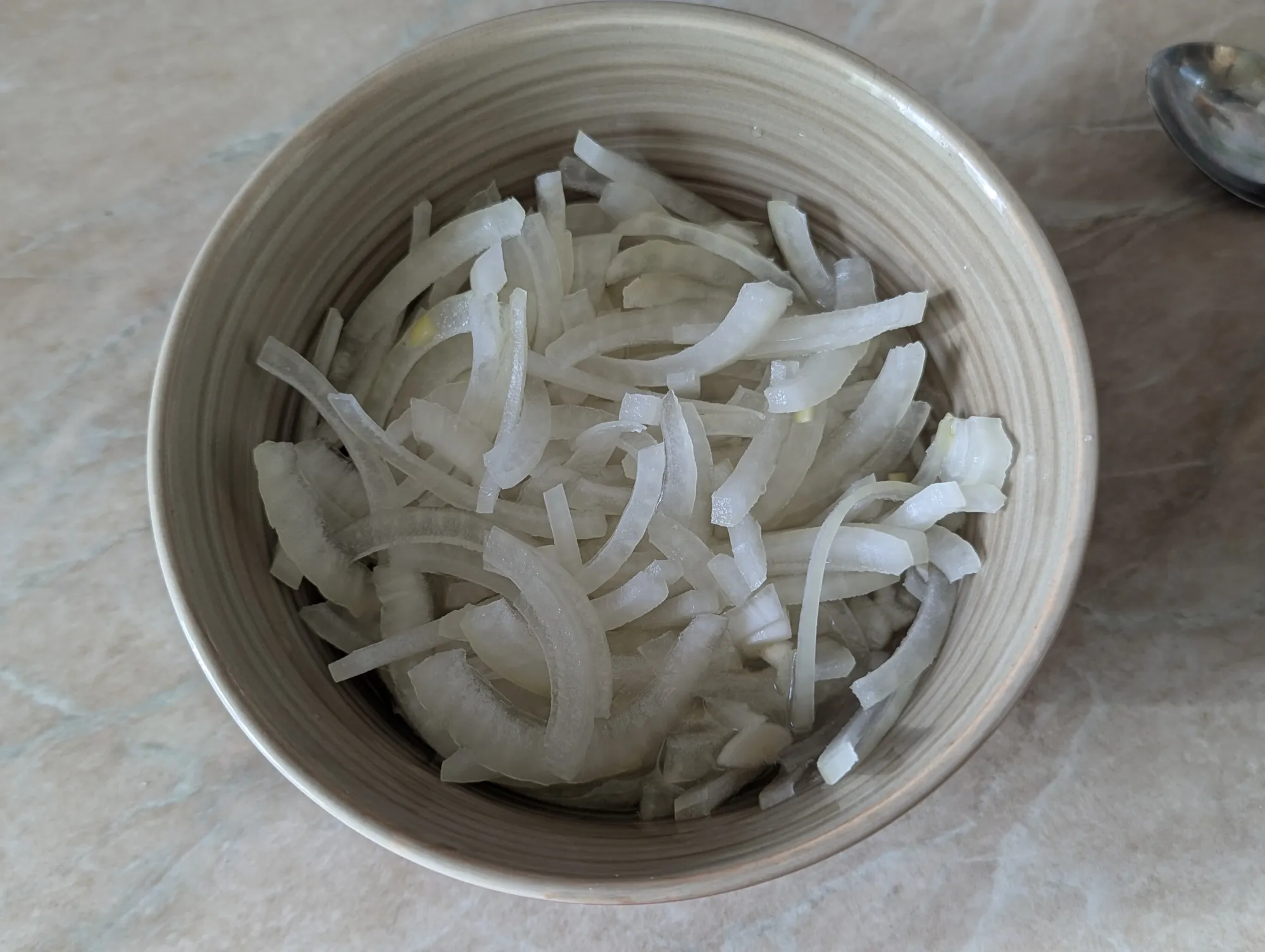 Треть лука тонко режем полу- или четвертькольцами (как больше нравится), затем отходим поплакать. Умываемся, возвращаемся, заливаем этого негодяя оставшимся маринадом и так же даём настояться.