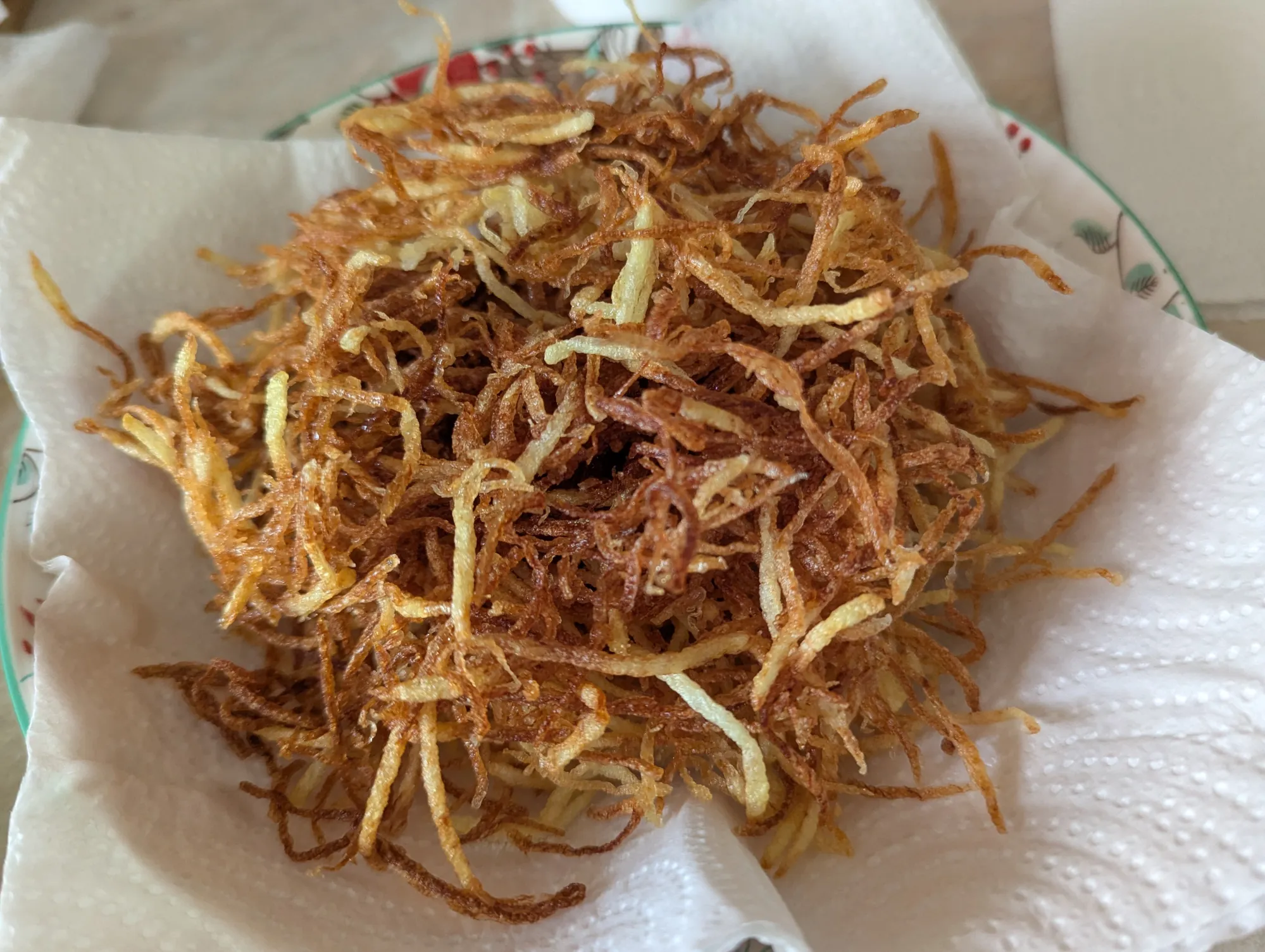 Теперь моё самое «любимое» – картошка. Сливаем с тазика воду, саму соломку кидаем на бумажное полотенце, пусть обсыхает. В это время греем подсолнечное масло на сковородке. Его лучше не жалеть, иначе всё слипнется. Отправляем туда порциями картошку и перемешкиваем во время жарки, чтобы, опять же, не получить ком. Ни в коем случае не отвлекаемся, сгорает она на раз-два. Готовую картошку откидываем на бумажное полотенце – пусть полежит, лишнее масло в салате нам не нужно.