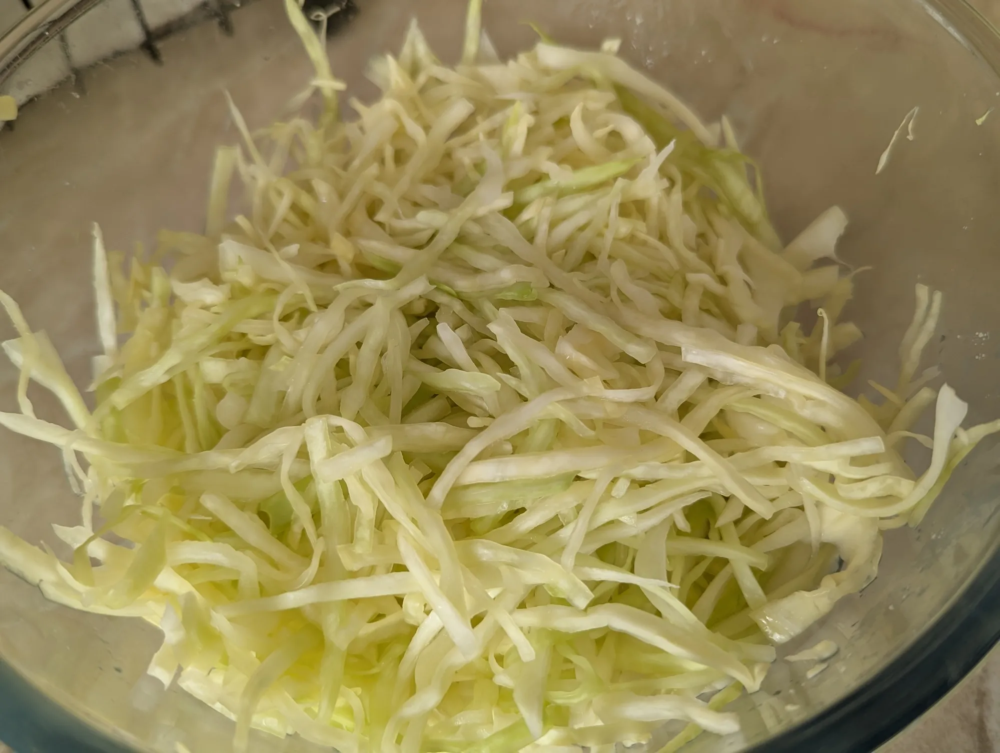 Настала очередь капусты. Её тоненько шинкуем, подсаливаем и от всей души жамкаем, чтобы стала помягче. И – не поверите! – снова убираем в сторону.