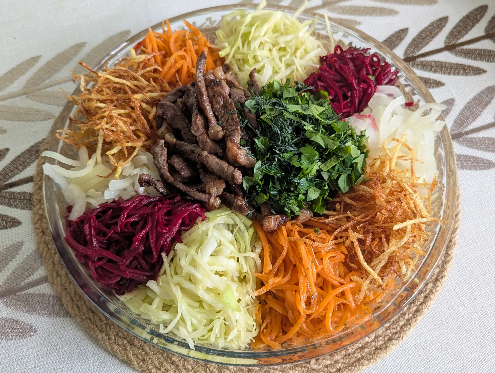 Не скажу, что он чем-то уникален – в других регионах есть похожие салаты, например, «Козёл в огороде», «Кучка». Недавно вот @malenkiy приносила в комменты картинки с салатом «Солнце Тбилиси» – тоже вроде бы похожий, но всё равно не точь-в-точь.