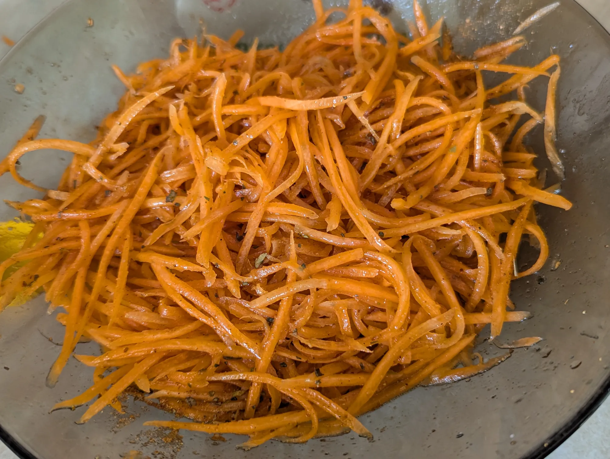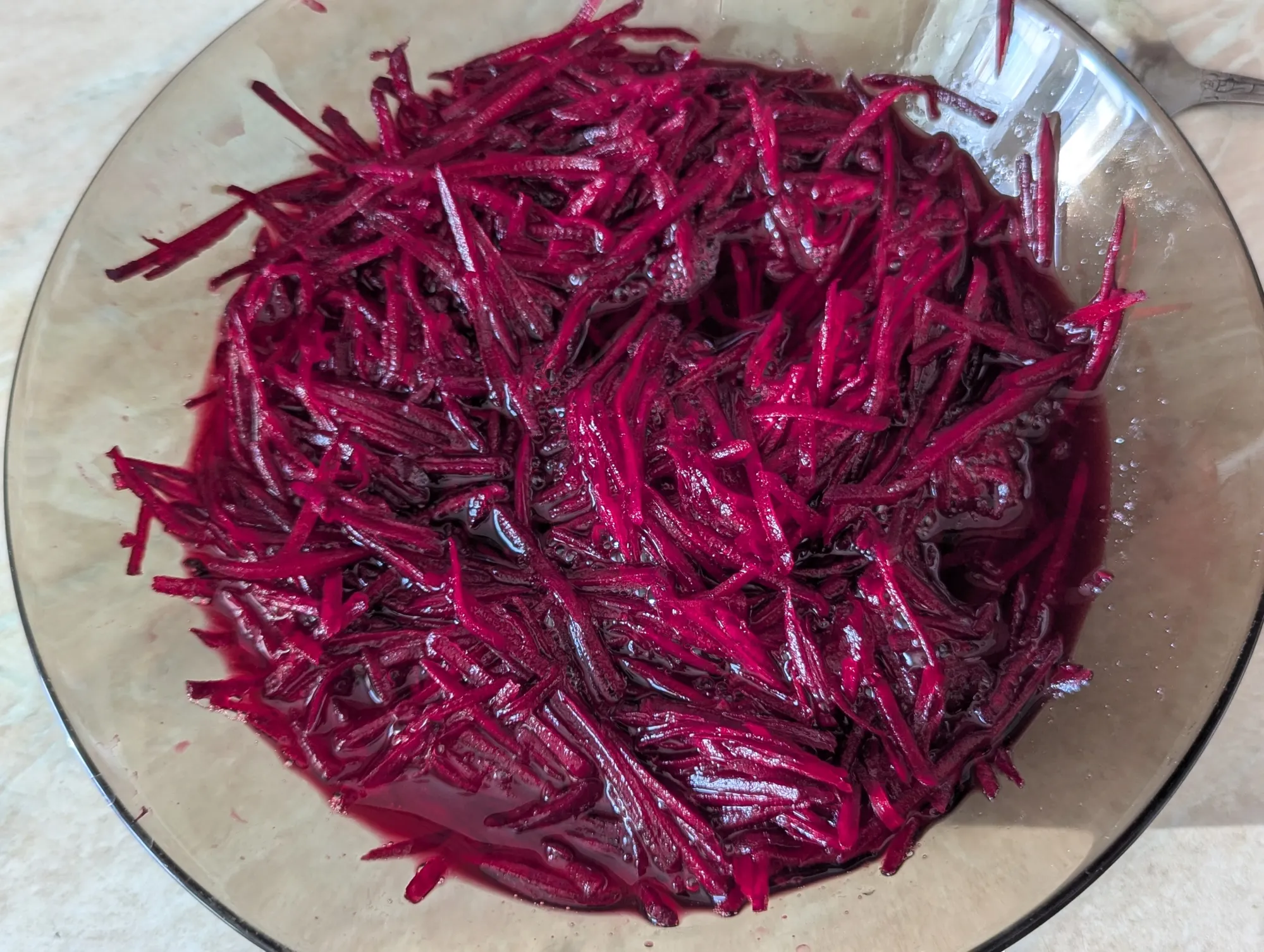 Берём морковь и свёклу, трём на тёрке для корейской моркови в отдельные ёмкости. Пока далеко не убрали тёрку, трём и картошку, кидаем её в тазик с водой и пока про неё забываем. В свёклу добавляем половинку нашего маринада и оставляем ждать своего часа.