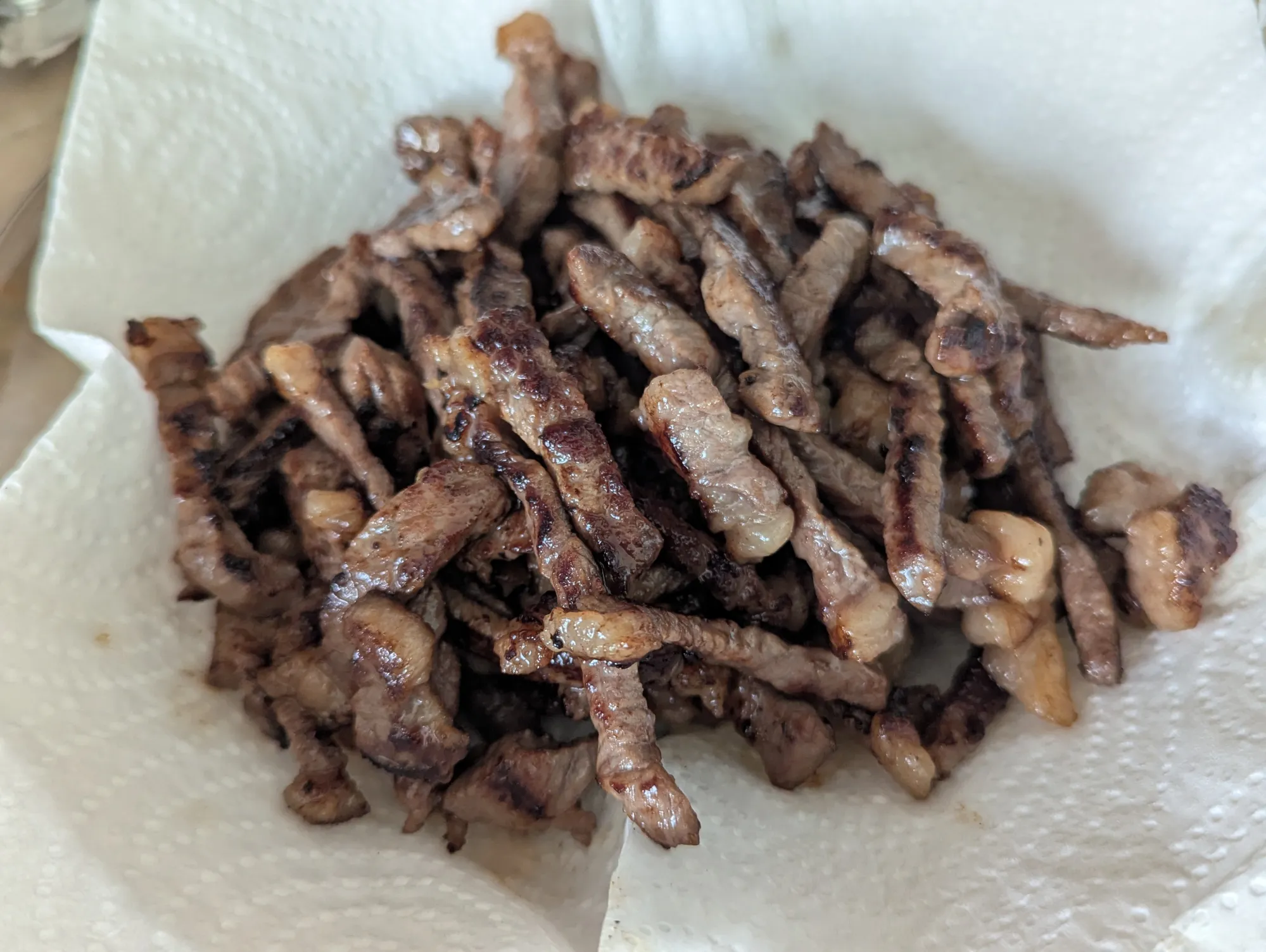 Мясо тонко режем поперёк волокон, добавляем немного соевого соуса. Даём постоять минут десять, а затем быстро обжариваем на сковородке. И молимся, чтобы не довести до состояния подошвы.