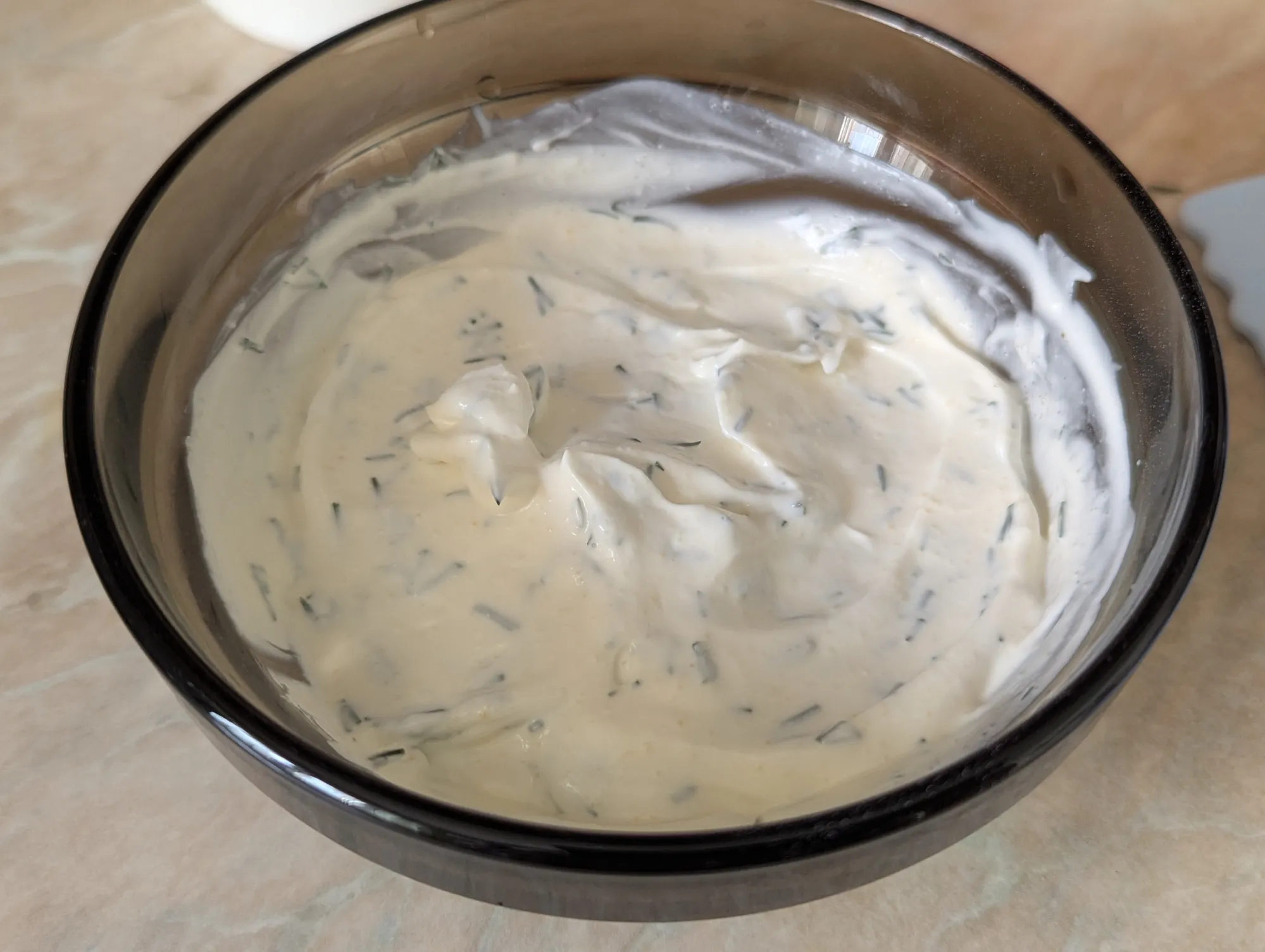 В отдельную плошечку помещаем соус – это может быть как просто растительное масло, так и майонез или сметана. Аутентичнее первые два варианта, но я предпочитаю смешать сметану с сухим чесноком и нарезанным укропом.