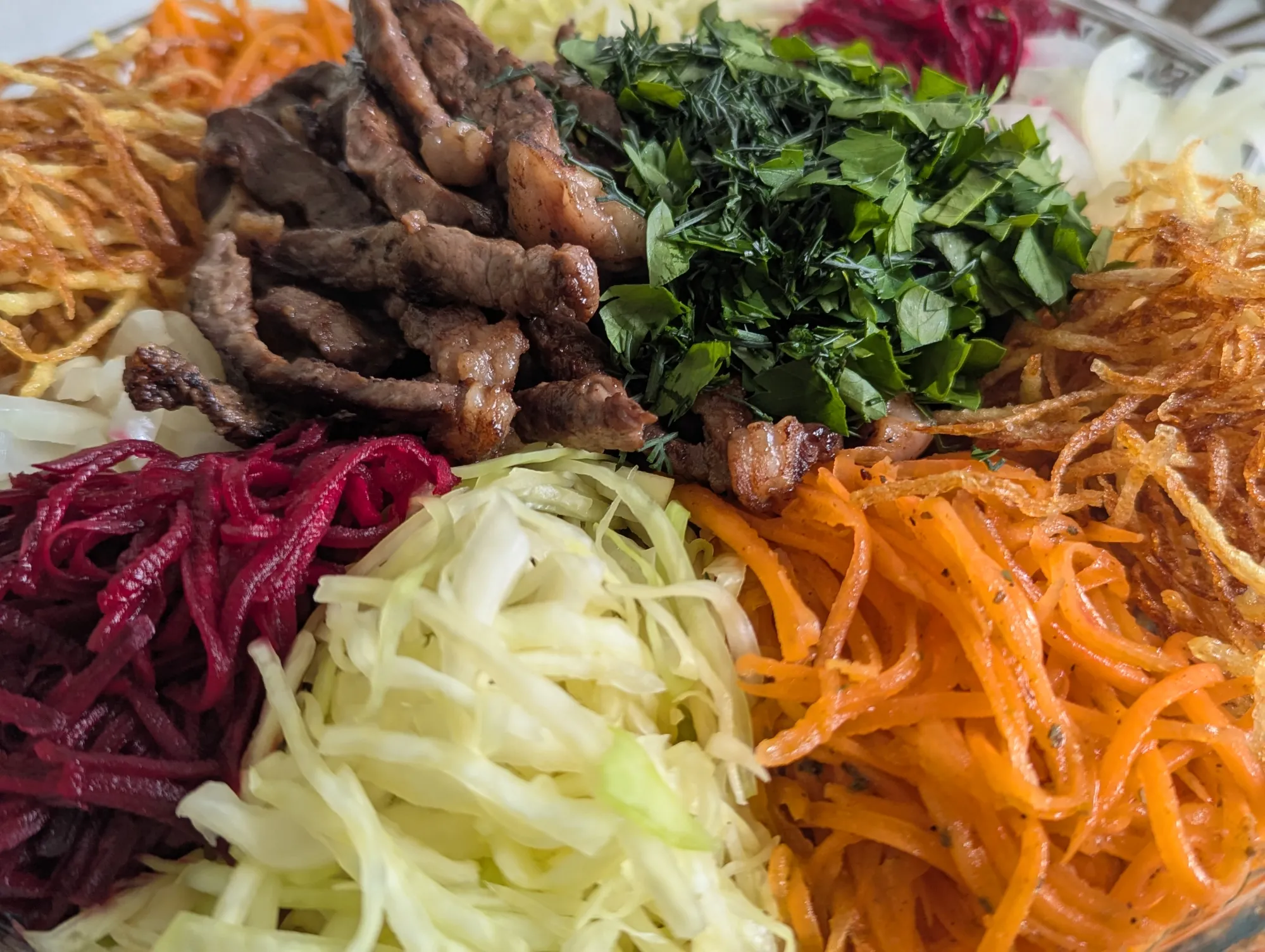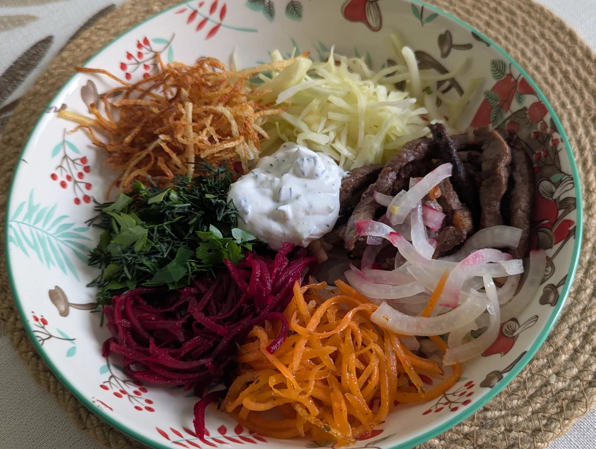 Секторами по краю тарелки раскладываем морковь, свёклу, капусту, картошку и лук, в центр кладём мясо и зелень. И радостно (нет) идём мыть эти миллион чашечек, которые мы испачкали во время готовки! У кого посудомойка – моё почтение.