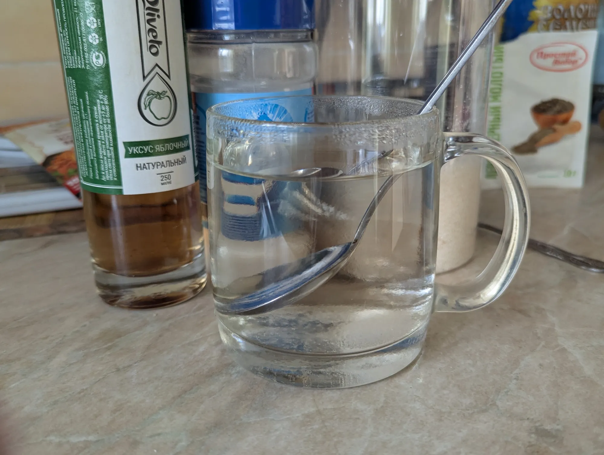 В стакан добавляем чайную ложку соли, две чайные ложки сахара и две столовые ложки уксуса, затем заливаем кипяточком из чайника. Хорошенько размешиваем до растворения крупинок. Можно попробовать и отрегулировать вкус под себя. Ненадолго убираем в сторонку, нам пока нечего им заливать.