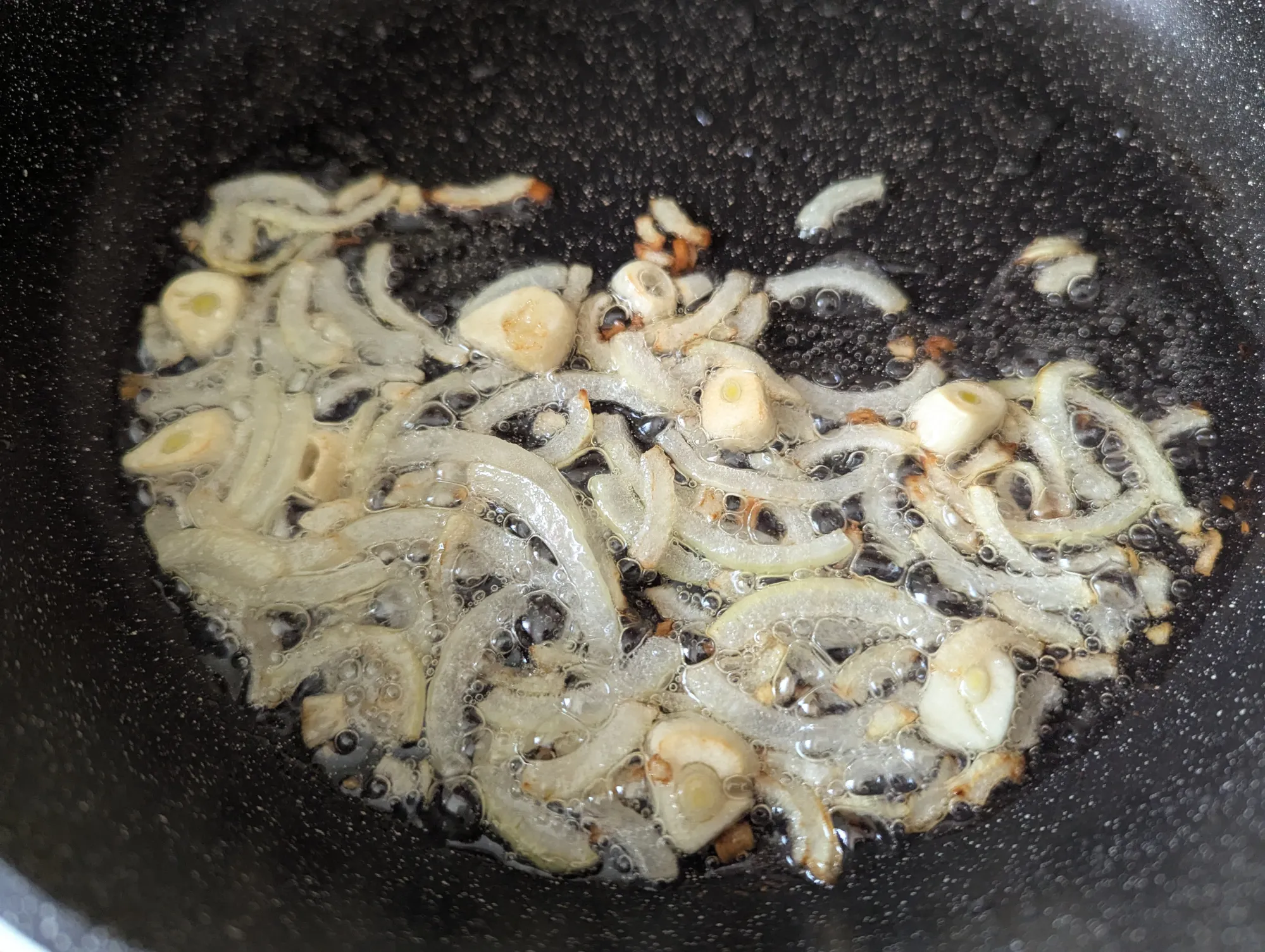 С морковью чуть интереснее. Мы используем готовые специи для корейской морковки, так что обращаемся к упаковке. Там нам говорят добавить две чайные ложки приправы, две чайные ложки соли, одну столовую ложку сахара и полторы столовые ложки уксуса. Выполняем. Всё хорошо перемешиваем, немного жамкаем. Берём оставшийся лук, режем так, чтобы его потом можно было вытащить из масла, с чесноком такая же история. Достаём сковородку, наливаем пару-тройку щедрых столовых ложек масла, греем. Кидаем туда лук и чеснок, обжариваем до аромата, потом аккуратно их вынимаем и смело льём горячее масло в морковь. Тщательно перемешиваем и оставляем мариноваться.