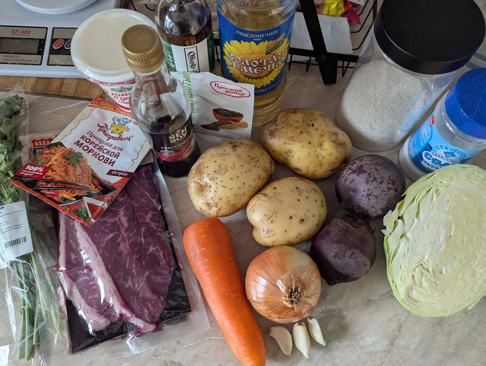 Представляет он собой разноцветные кучки, разложенные секторами на большом блюде: морковка, свёкла, капуста, лук, картошка и говядина. Овощи при этом свежи и/или хрустящи, никакой варки.