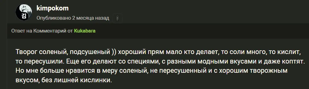 На вкус что-то между творогом и сыром, прям достаточно такой солёный и кислый. Комментарий от профессионала:
