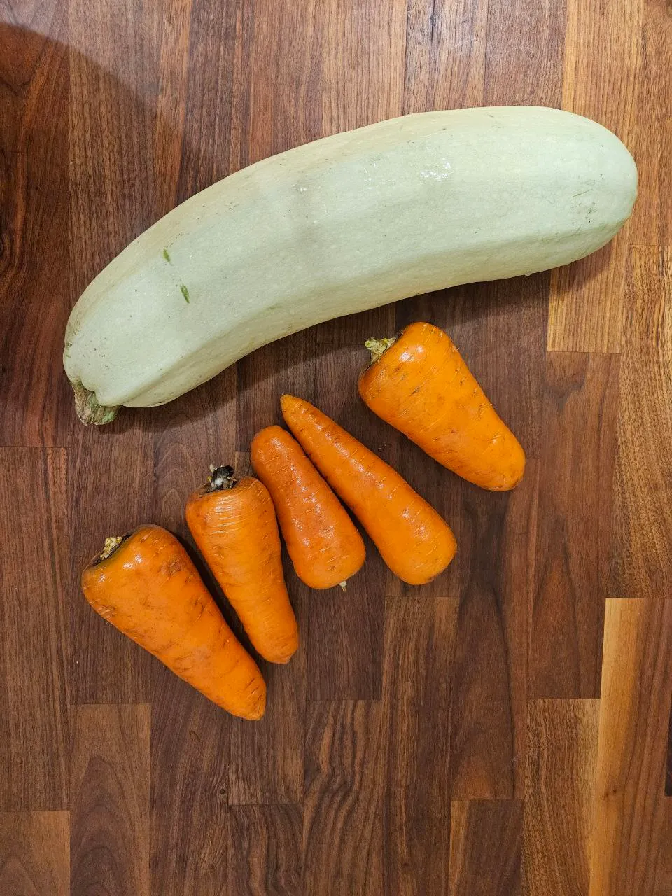 Берем кабачок, морковку, картошку... а, нет, картошка внезапно дома закончилась, поэтому в блюдо не пошла.