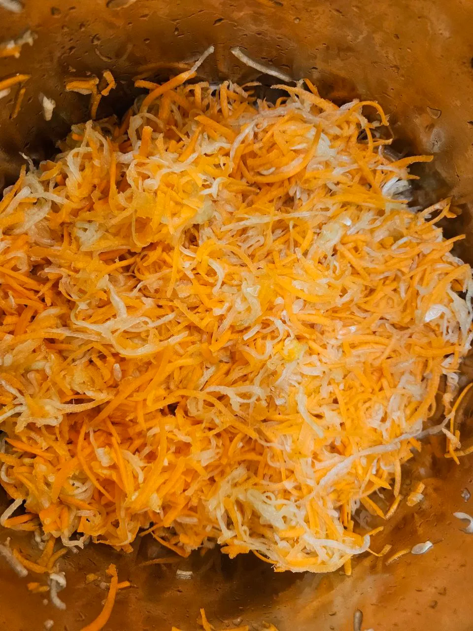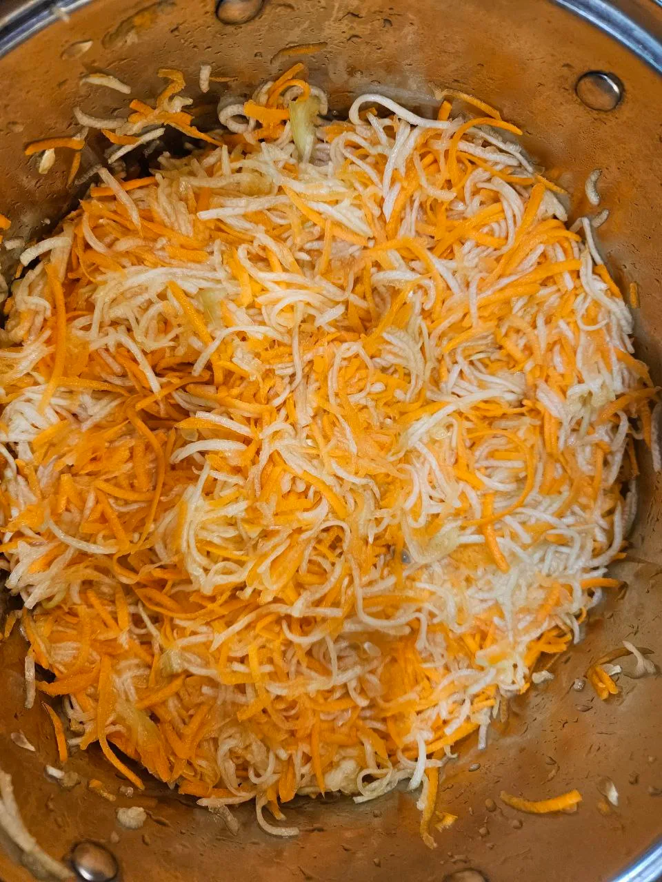 Подсаливаем и убегаем по своим делам на 15 минут. Когда возвращаемся, все плавает в соке от морковки и кабачка. Выжимаем.