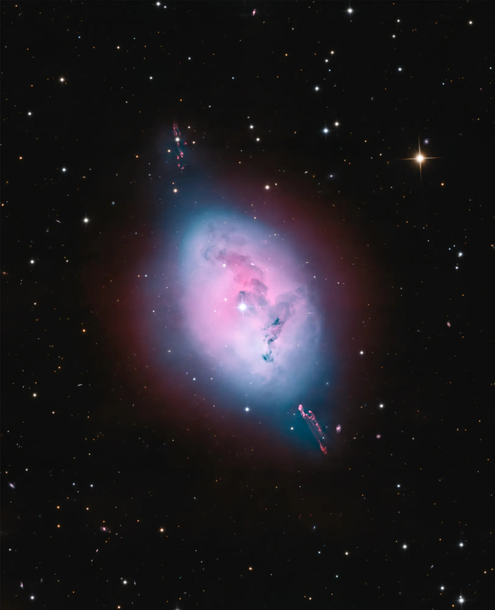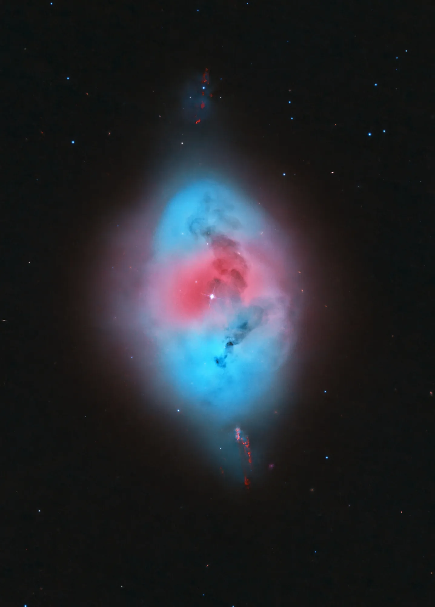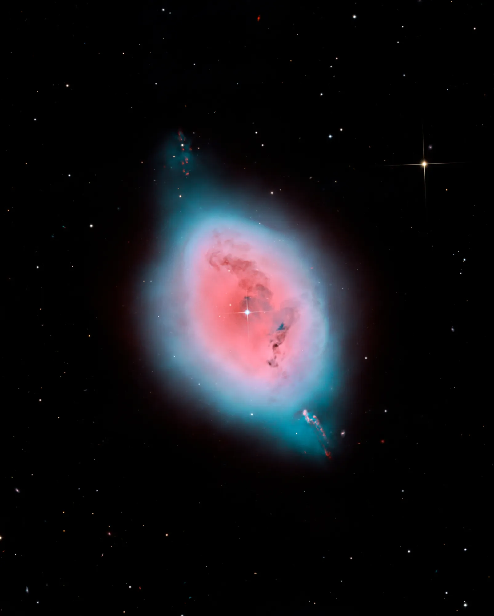 Является остатком умирающей звезды типа Солнца и состоит из системы сброшенных газовых оболочек и бывшего ядра звезды — белого карлика. Синий цвет — свечение дважды ионизированного кислорода, красноватый — водорода. Вытянутые структуры по краям — выбросы, созданные звездой ещё до своей смерти.