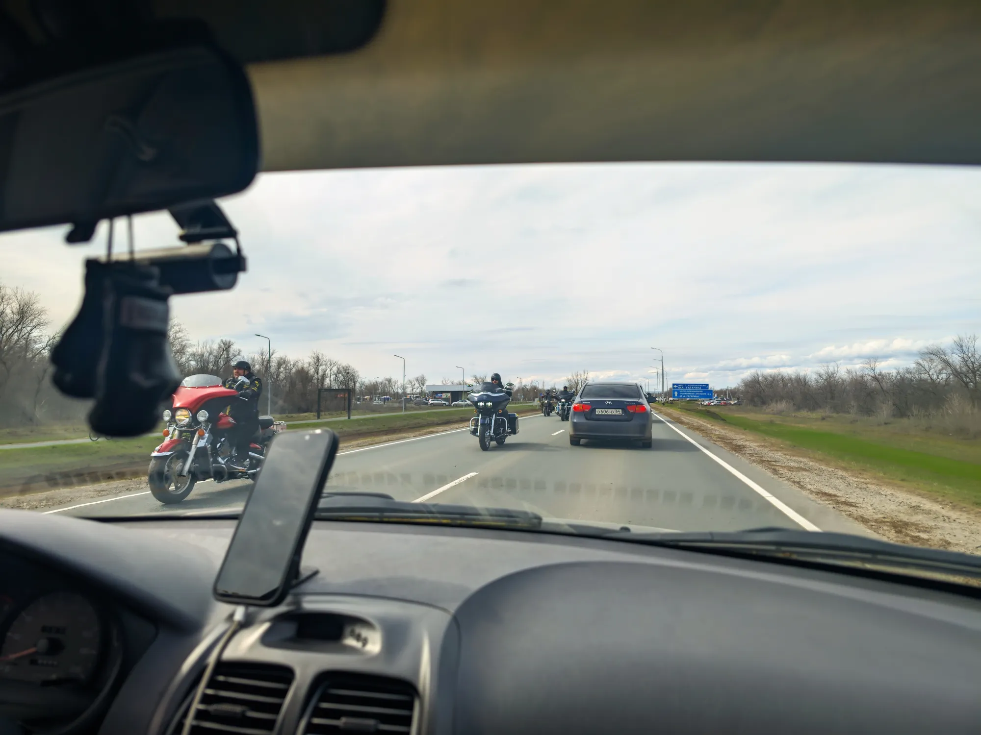 Едем. Было много байкеров и велосипедистов. В обе стороны.