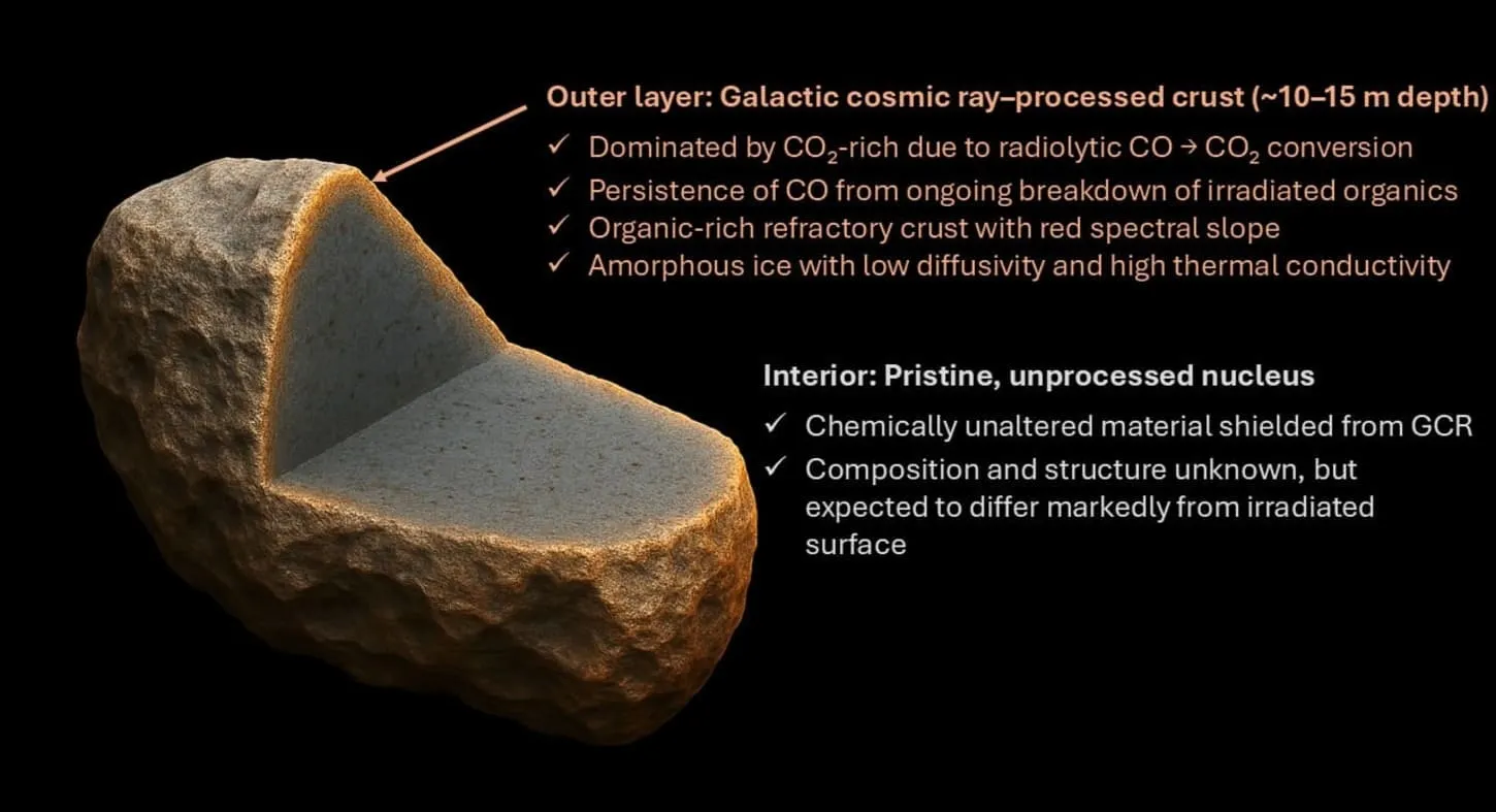 По оценкам, на 3I/ATLAS диоксида углерода в 7.6 раз больше, чем воды. Комета также богата угарным газом и даже покрыта «коркой» из органических молекул — это видно по тому, как ее вещество отражает свет. До сих пор предполагалось, что так сложилось в ее «родной» системе: там во время формирования было очень много углекислого газа. Недавно исследователи из Бельгии и США подвергли сомнению эту версию в своей статье, выложенной на сервере препринтов arXiv․org. Они подчеркнули, что нужно учесть важный фактор — галактическую радиацию.