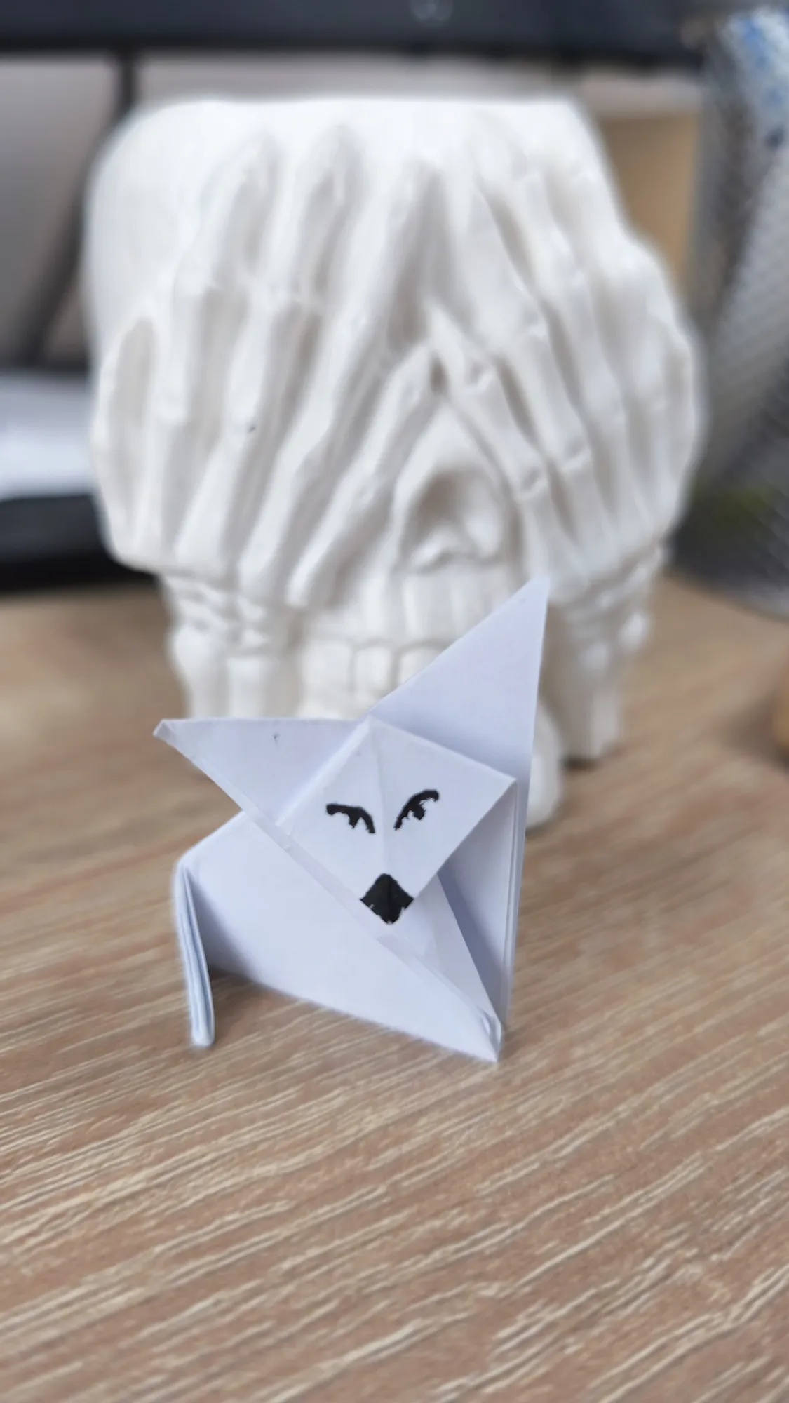 Оставшийся одинокий капюшон или голову, кому как угодно, можно свернуть и сложить прямо во внутрь вот этой складки, которая является внутренними стенками будущего стаканчика. Но можно отогнуть и наружу, неважно. Но просто снаружи он будет болтаться и, скорее всего, будет мешать вам пить.