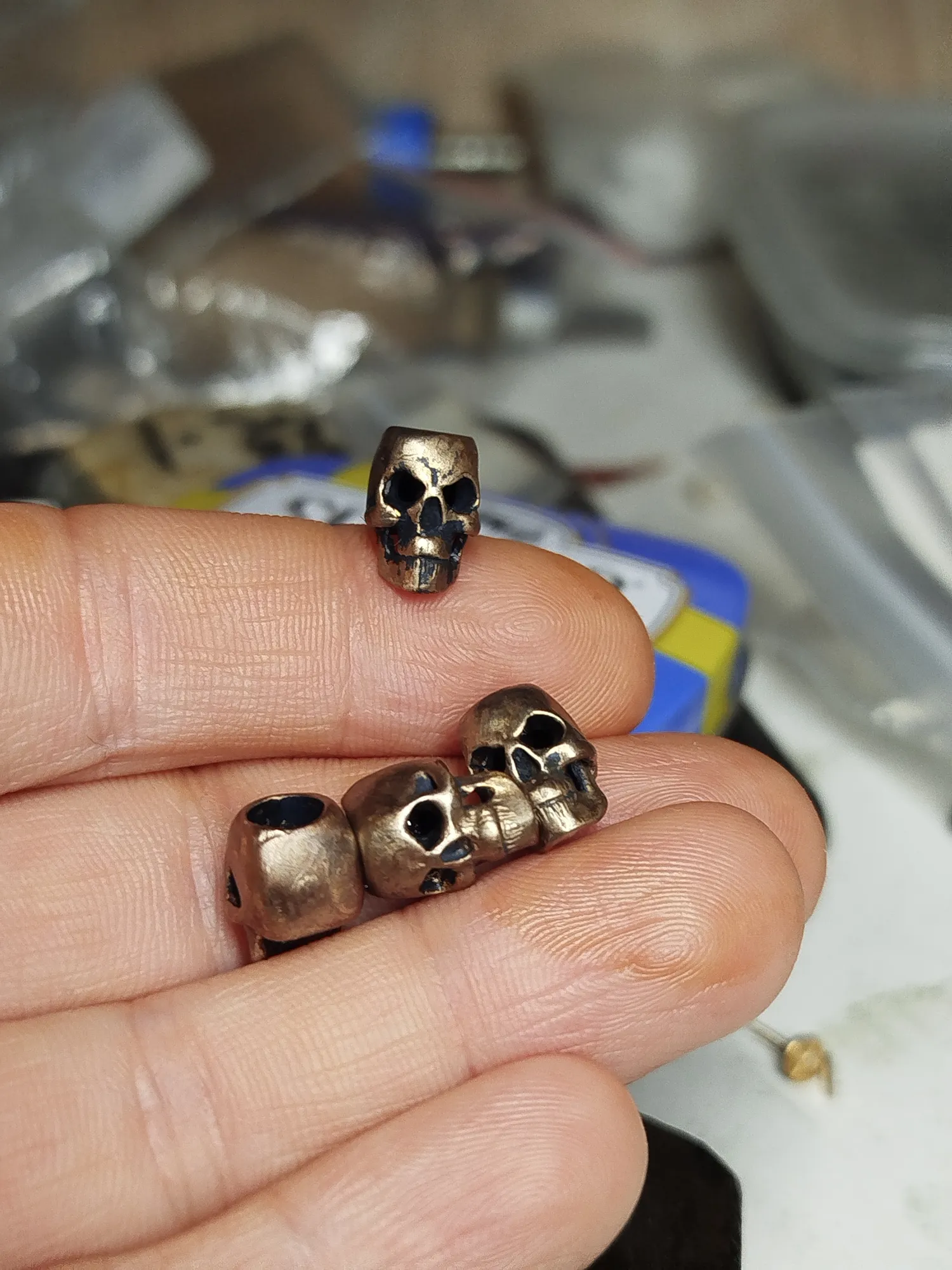 Изначально я полировала черепушки в глянец, чернение не клала- была молода и глупа, исправляюсь. Дополнительно еще раз пролезла резинкой в отверстия, еще раз прошла вертолетиком.