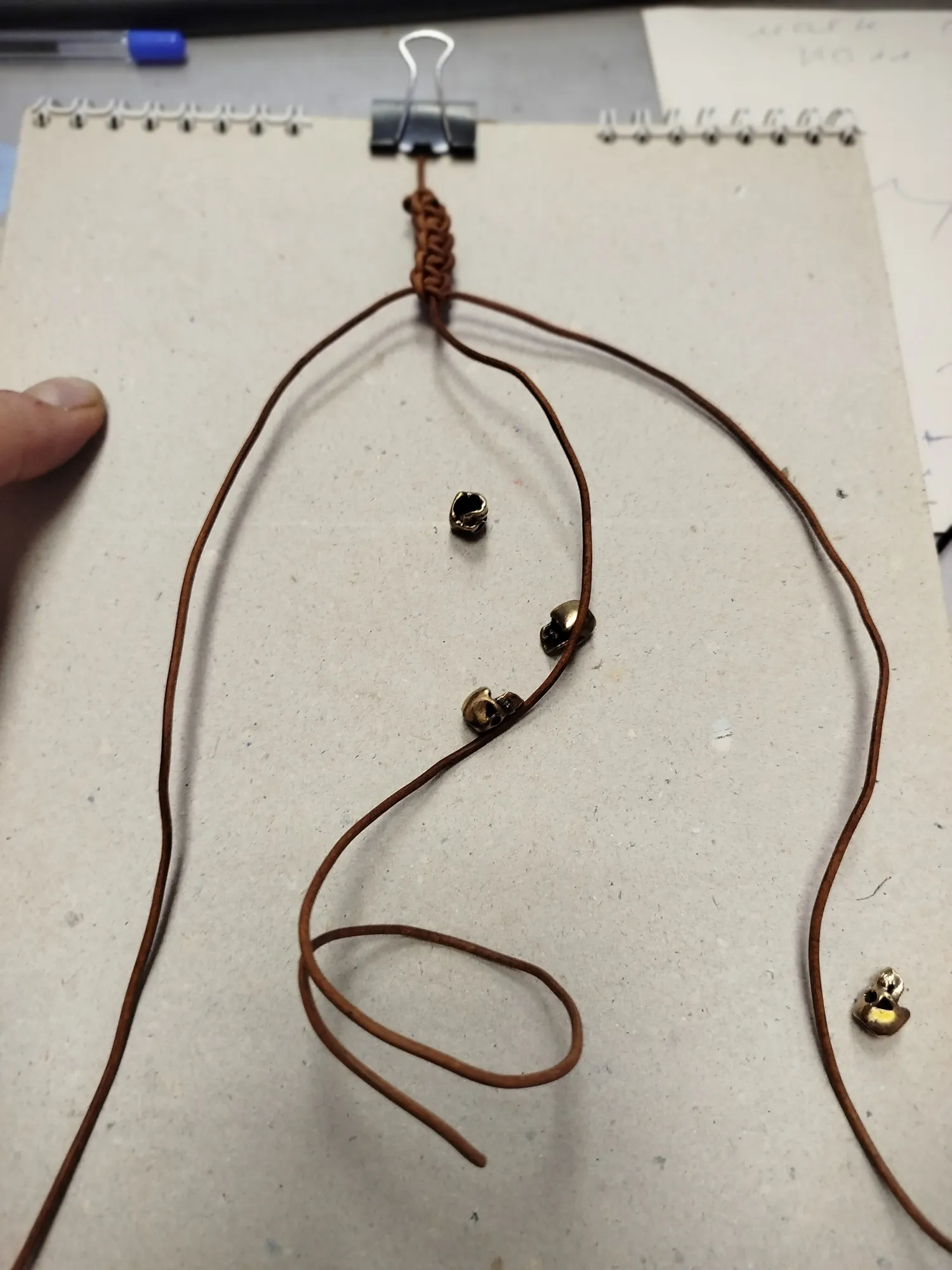 Собственно, осталось только сплести браслет. У меня шнур из прессованной кожи, диаметр 1,8 мм, длина 3 метра (но много осталось), сами черепушки, доска (в моем случае кусок от альбома для рисования) и канцелярский зажим. Плету из расчета на 20 размер + на замок. Плетение называется "шамбала".