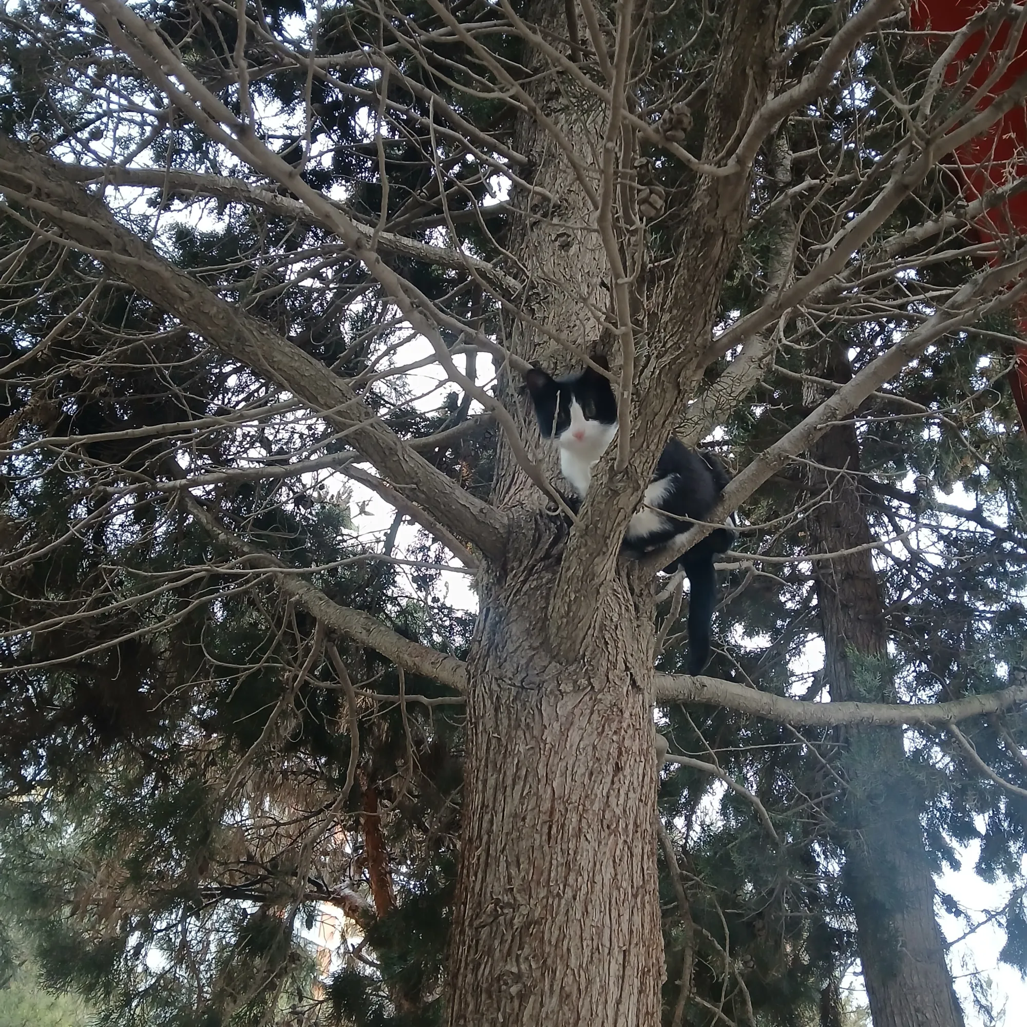 Я зову их поесть, а Бим застрял на сосне) но потом спустился...