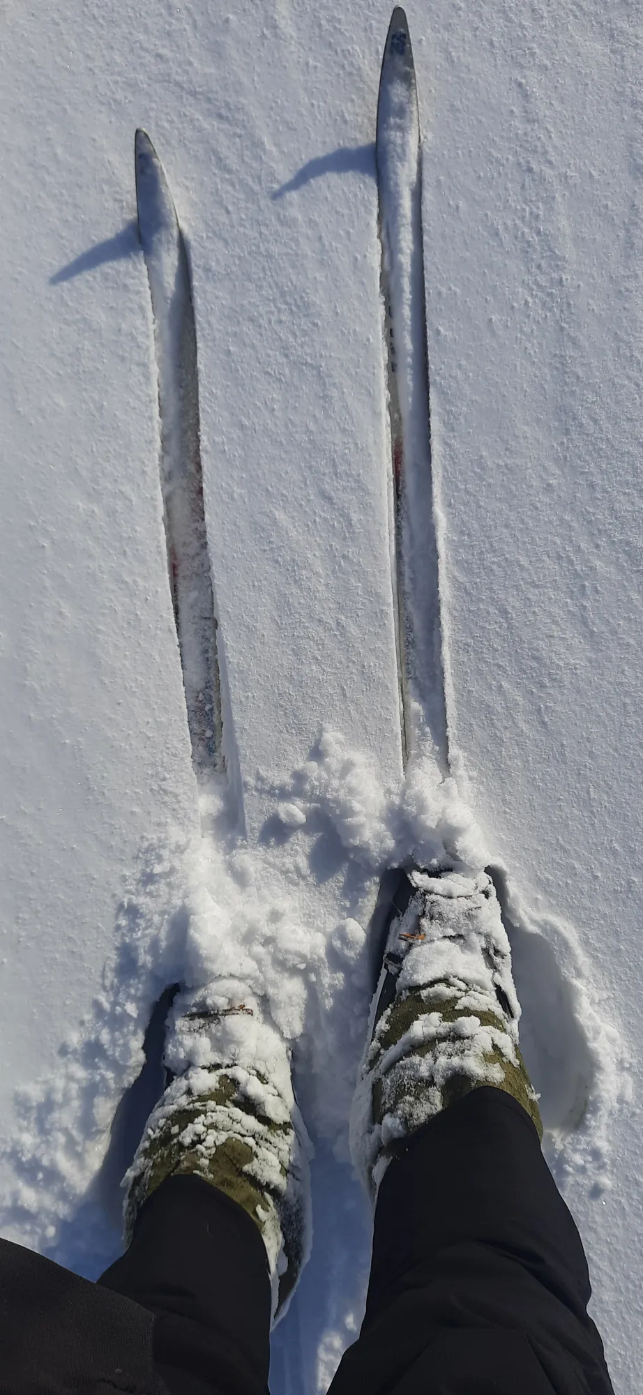 На следующий день я пошарился у бати в гараже и на свет божий были извлечены мои старые лыжи. Пылились двадцать лет и вот их час настал. Правда лыжи тонкие, беговые, да ещё и палок не сохранилось. Ну да ладно, идти по сугробам можно. И погода 9 марта выдалась отличная!