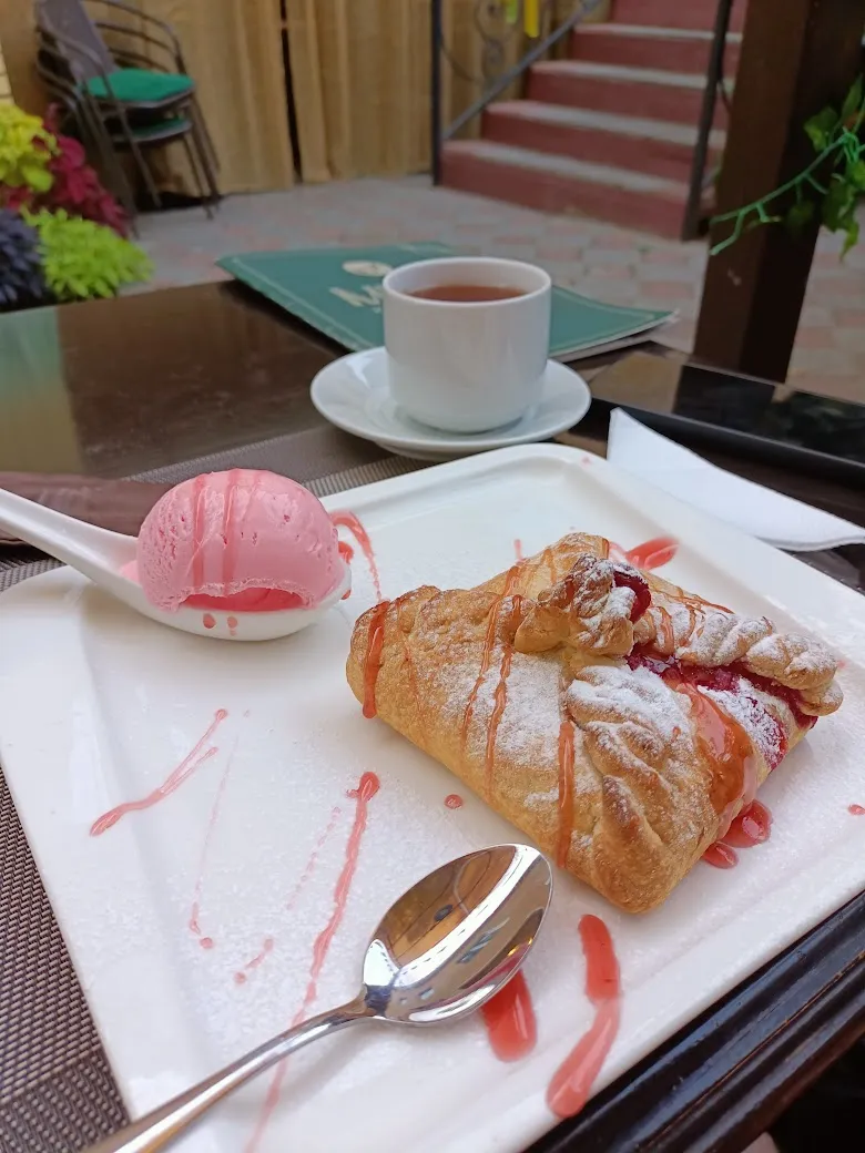 Отрезав кусочек и окончательно убедившись, что это не хитро заверченный рулет, а самая обычная студенческая слойка, отдала свою порцию мужу - очень не люблю слоёное тесто. Как назло, он тоже заказал штрудель, только с другой начинкой, поэтому поменяться едой не получилось, мне досталось только мороженое, а муж всеядный и остался доволен двойной порцией. Больше ничего я в этом кафе заказывать не стала.
