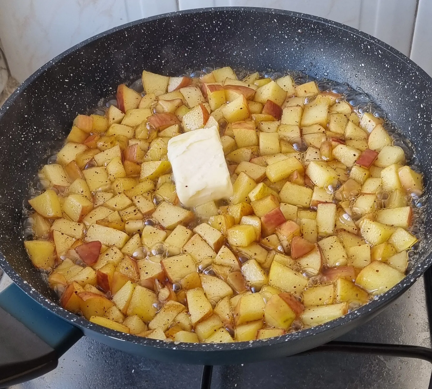 Тем временем подготовим начинку. Берём несколько яблочек: количество зависит от размера яблок, я обычно беру 3-4 среднего размера. Режем их кубиками, на дно сковороды насыпаем сахар, чтобы покрыть дно. Я никогда не отмеряю его на весах, так как сахар всё равно растает и мы его в итоге сольём.