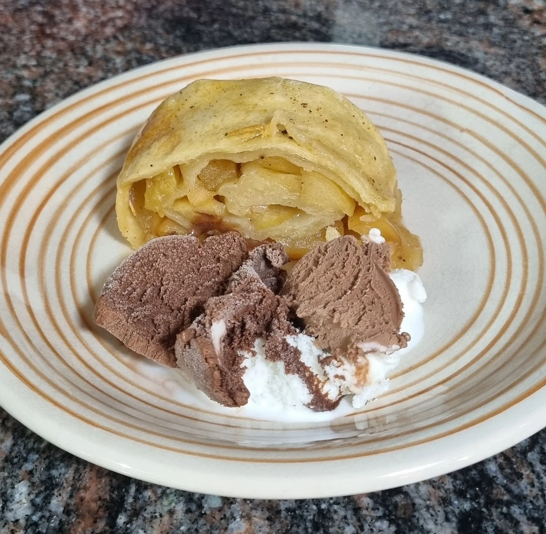 Подаём с шариком (или комочком, как получится) мороженого. Тесто снаружи получилось чуть хрустящим, внутри мягким. Яблочки нежные, сладкие. С чаем или кофе - очень вкусно!