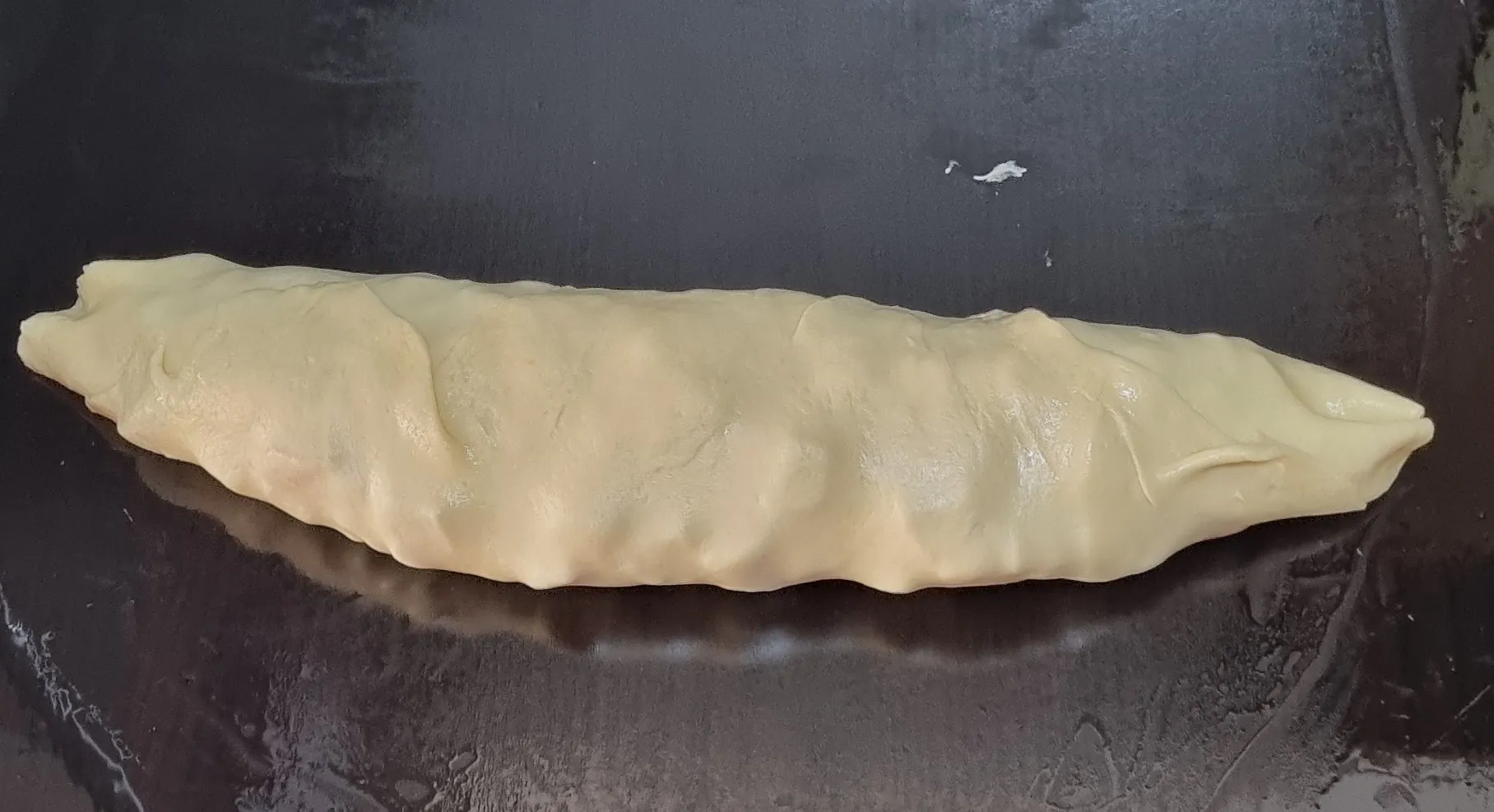 Скатываем внахлёст, чтобы получилась колбаска. Не защипываем тесто, просто как следует приминаем краешек, он не отвалится.
