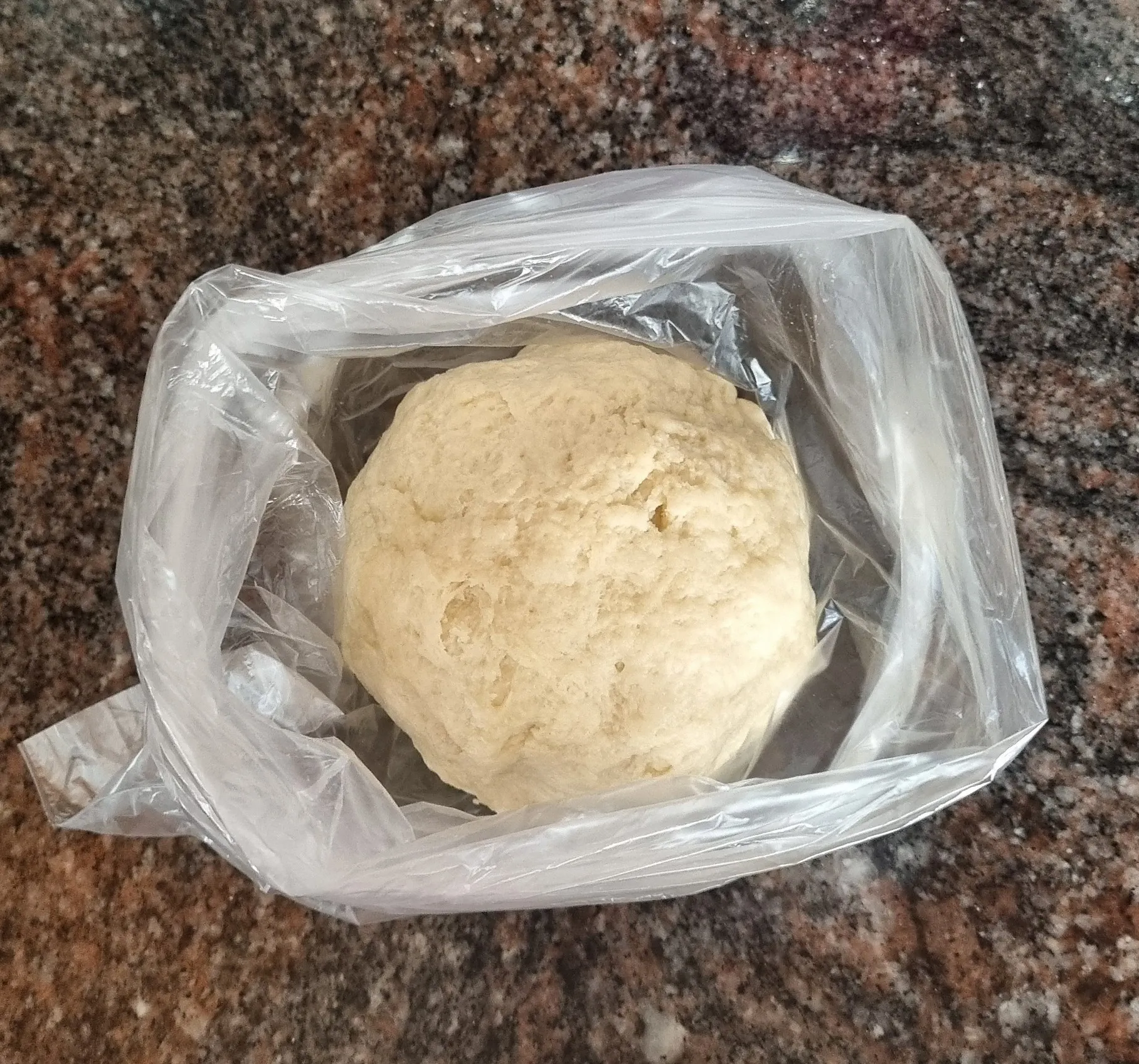 Замешали тесто до однородности, скатали комок - мы не стремимся к идеальной гладкости, оно всё равно потом раскатываться будет. И в холодильник в пакете на 30 минут.