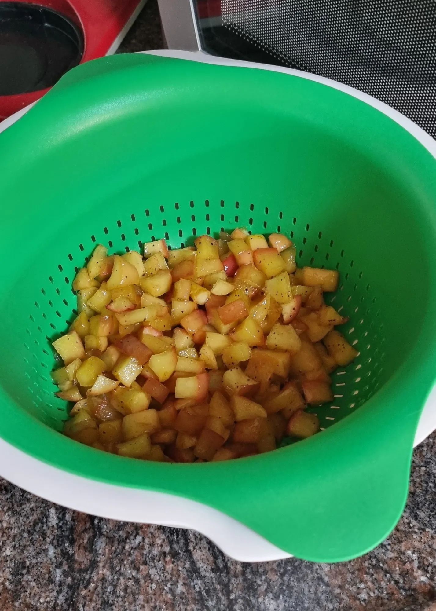 Ну вот и все, яблоки стали полумягкие, начинка готова. Сливаем через дуршлаг, но сироп не выливаем, он ещё пригодится. Оставляем яблочки остывать.