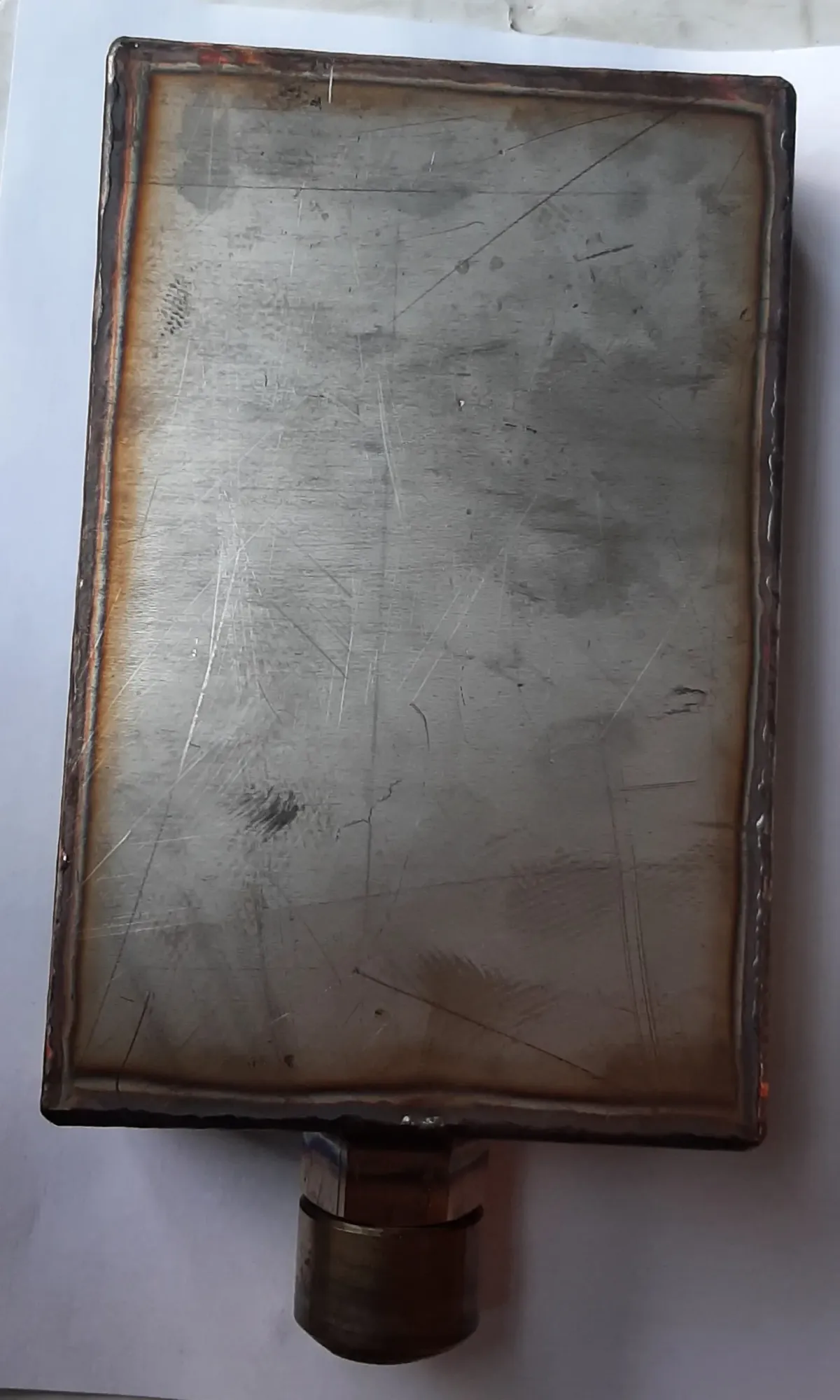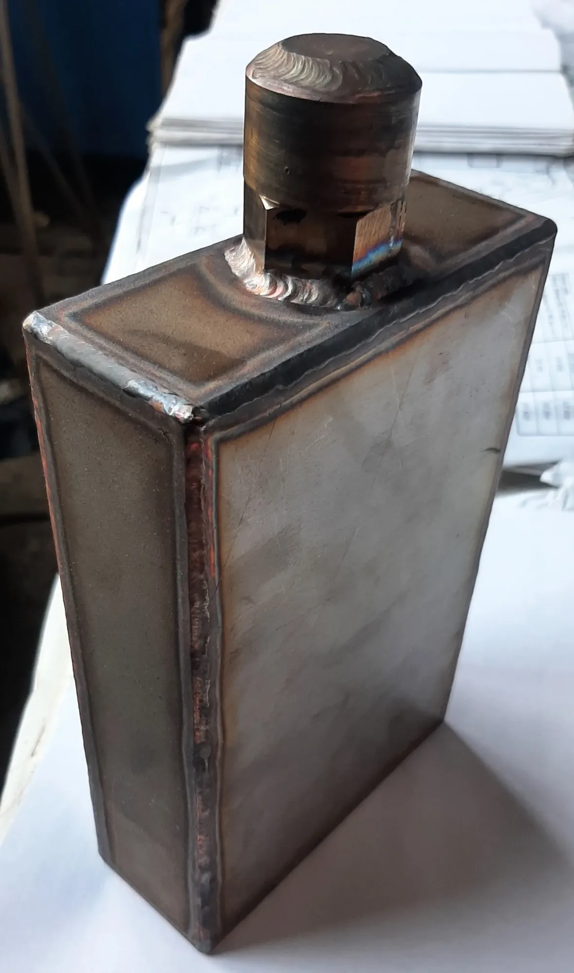 UPD: шакал я паршивый, забыл всем вам сказать: так как стенки после сварки получились немножко вогнутые, пришлось искусственно увеличить объём фляжки даванув в неё шесть, ёбаных блядь атмосфер нахуй, заодно проверил разорвало её или нет и она ещё, оказывается, нихуя не течёт, представляете?
