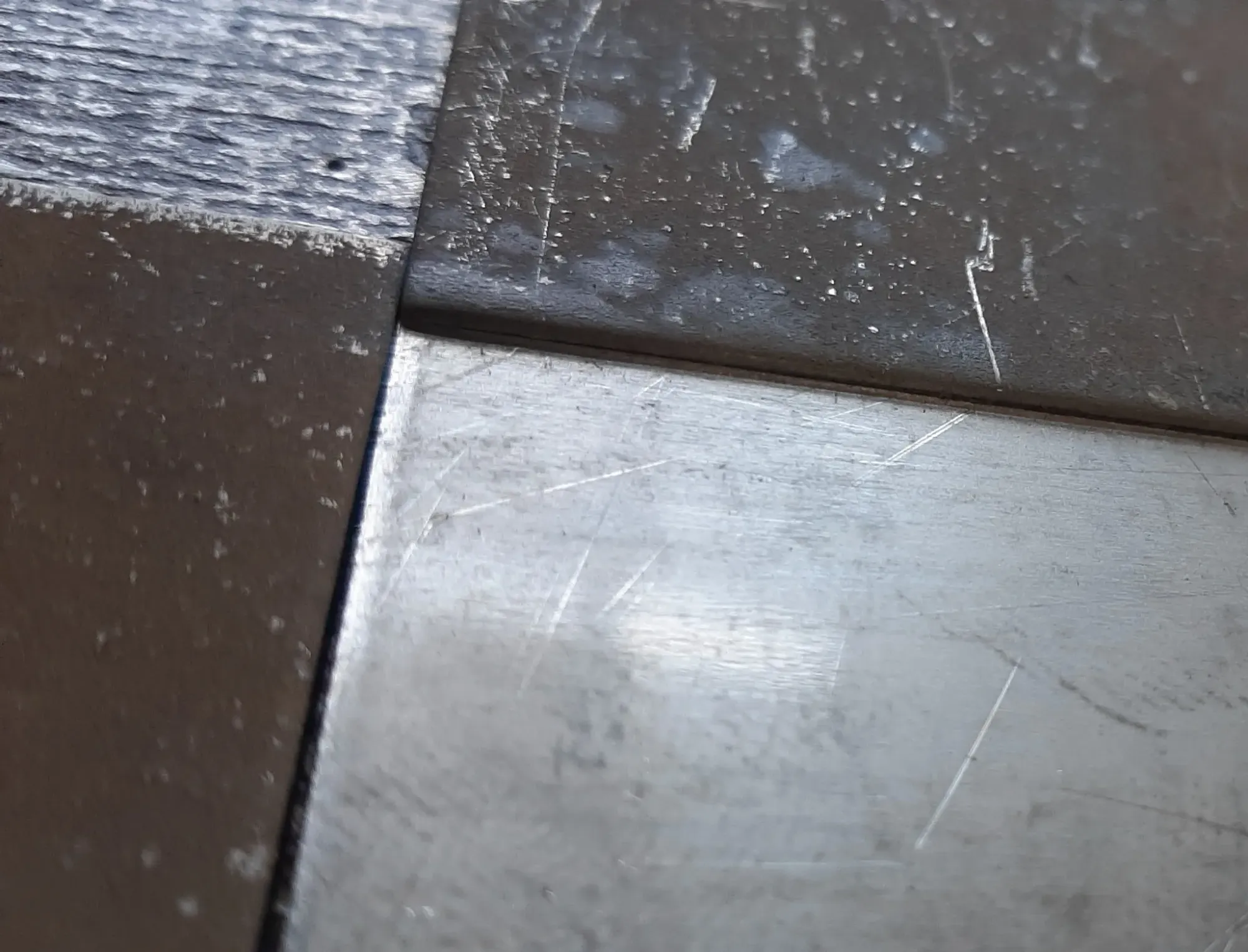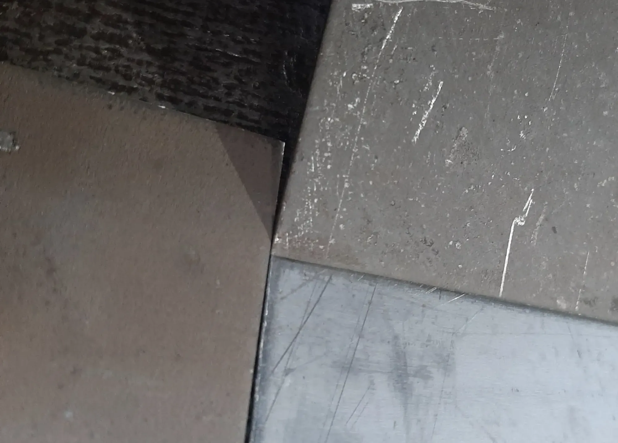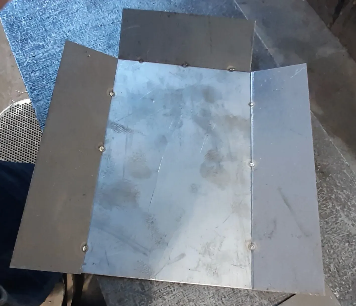 Из-за того что большой лист имеет толщину меньшую, чем боковые стенки (что видно на фотографии), нам приходится исхитриться и сделать так, чтобы внутренние кромки деталей совпадали, а не перекрывали только половину толщины примыкающего листа.