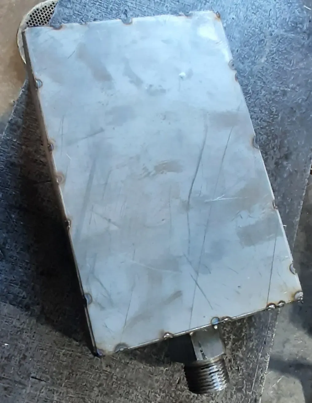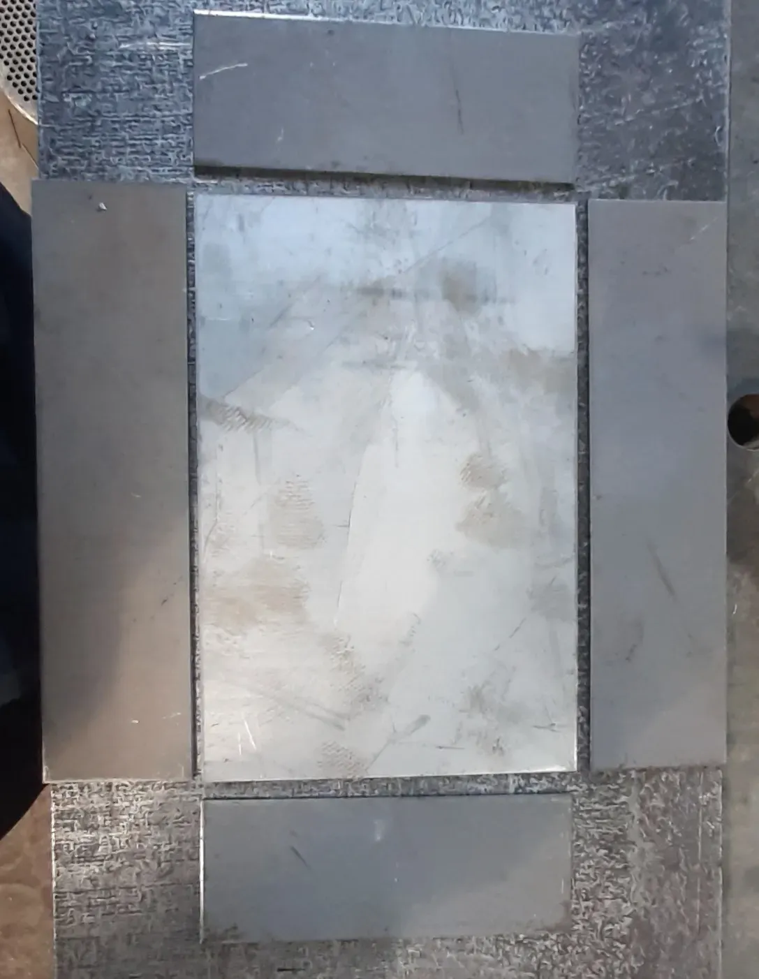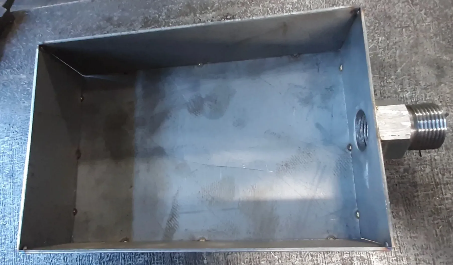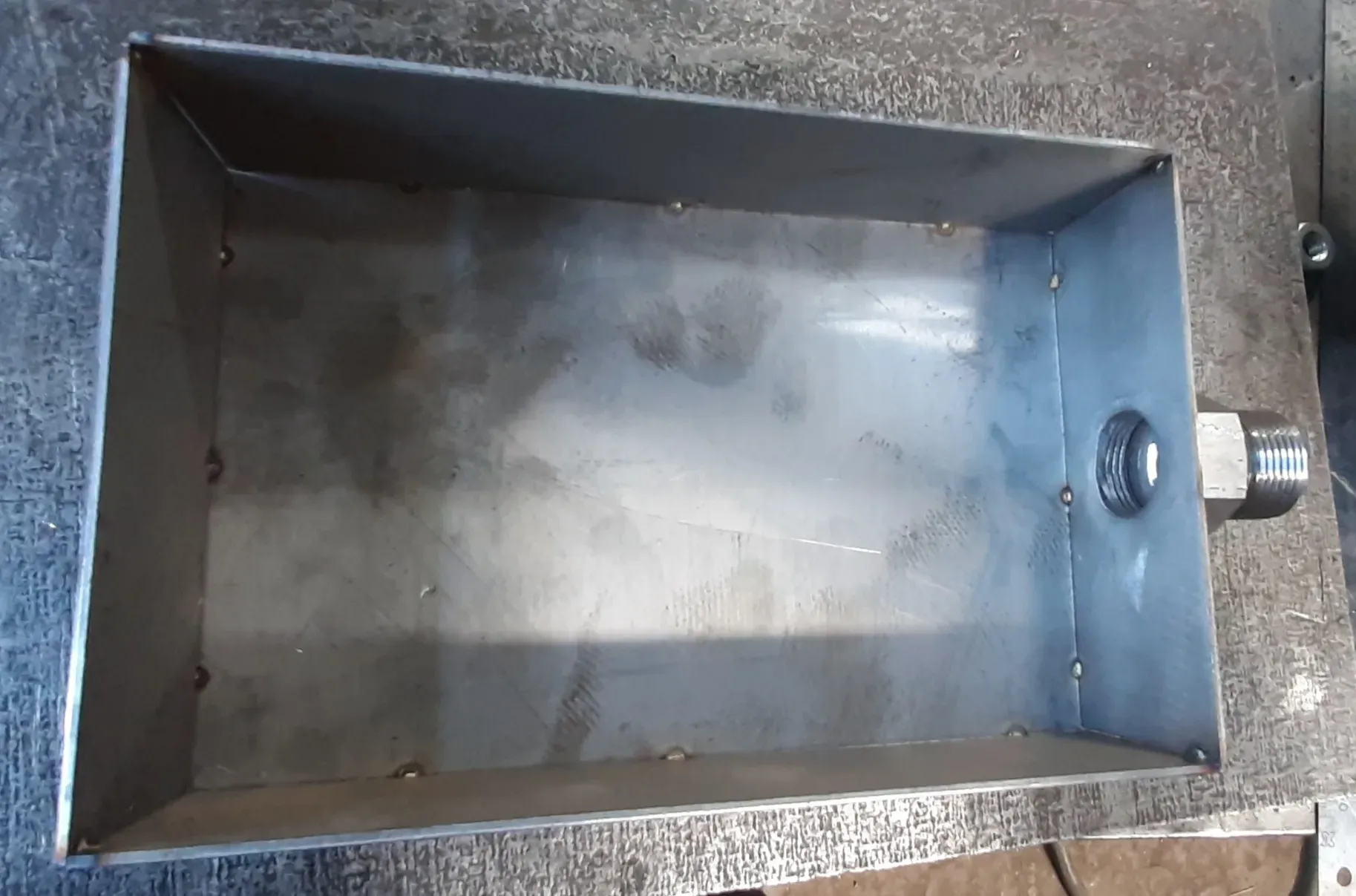 Из-за того что большой лист имеет толщину меньшую, чем боковые стенки (что видно на фотографии), нам приходится исхитриться и сделать так, чтобы внутренние кромки деталей совпадали, а не перекрывали только половину толщины примыкающего листа.
