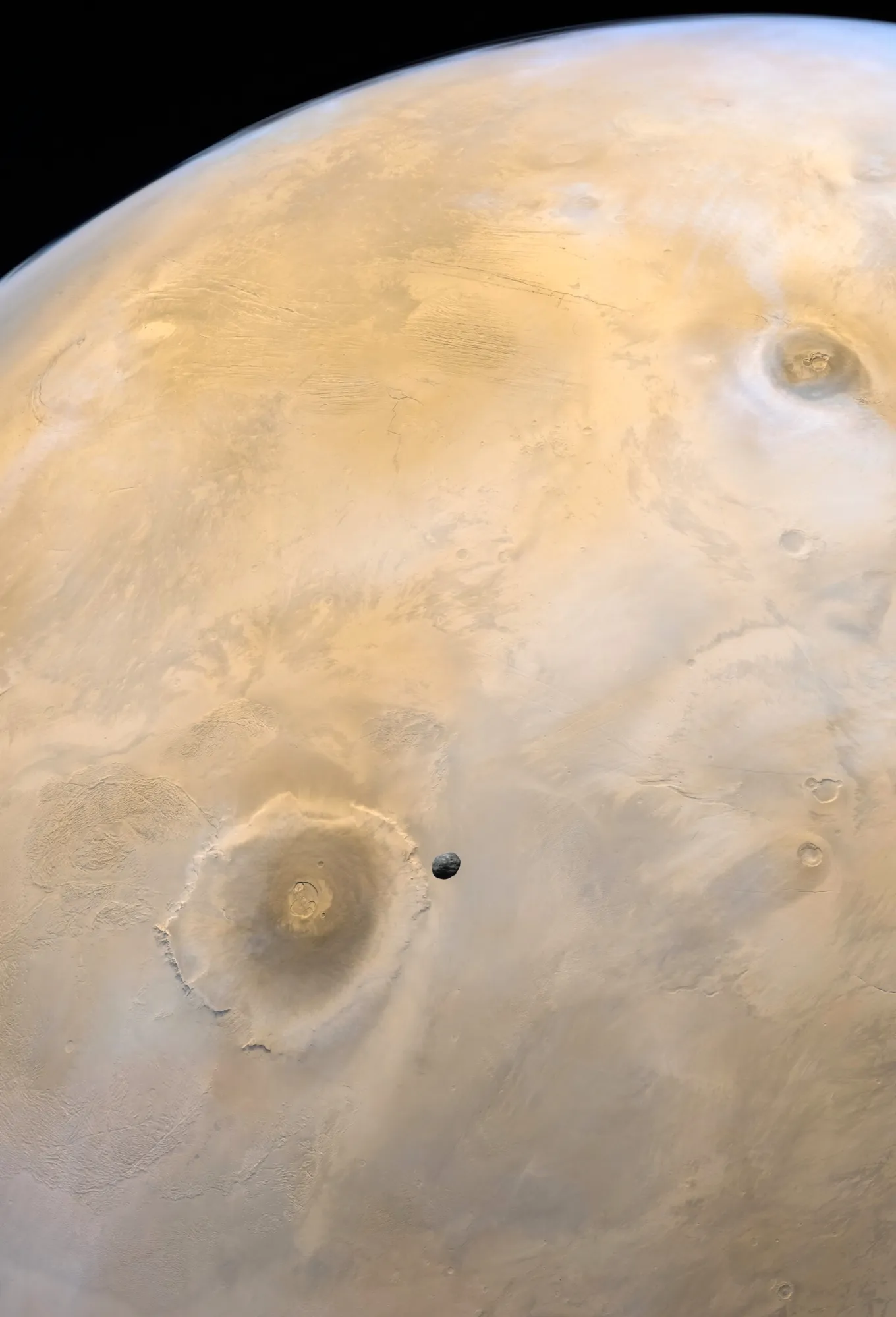 Фобос над Марсом на фоне величественного вулкана Олимп.