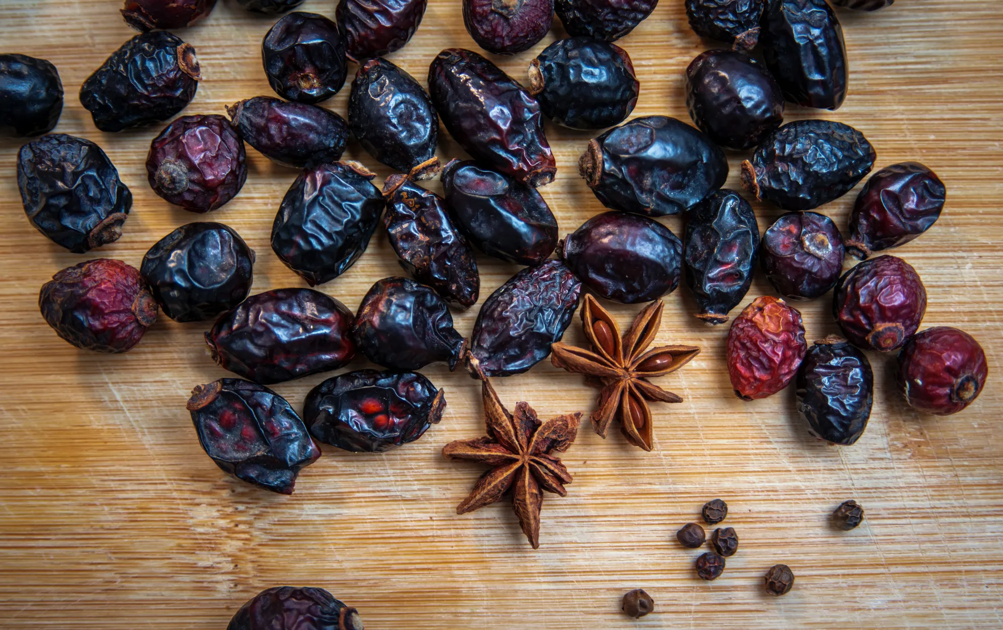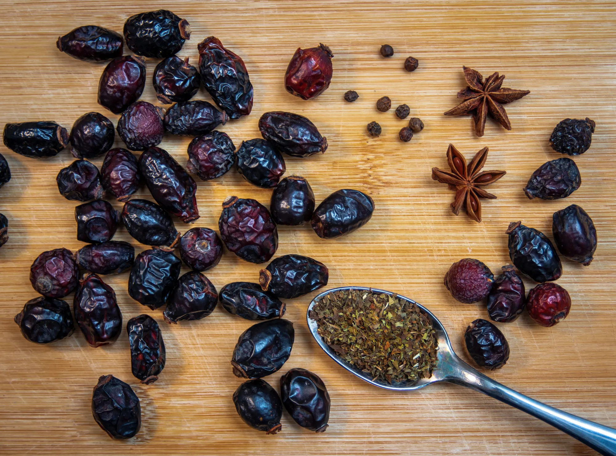 Для этого берём шиповник, пару кулачков, хорошо промываем. Добавляем пол-звёздочки бадьяна, или даже ещё чуть поменьше, маленькую ложку сушёной мяты, опционально 2-3 горошинки чёрного перца, столовую ложку сахара.