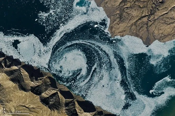 Эти две воронки особенно заметны: воронка слева закручивает фрагменты льда, а воронка справа выделяется благодаря отложениям, сходящим в воду с суши.