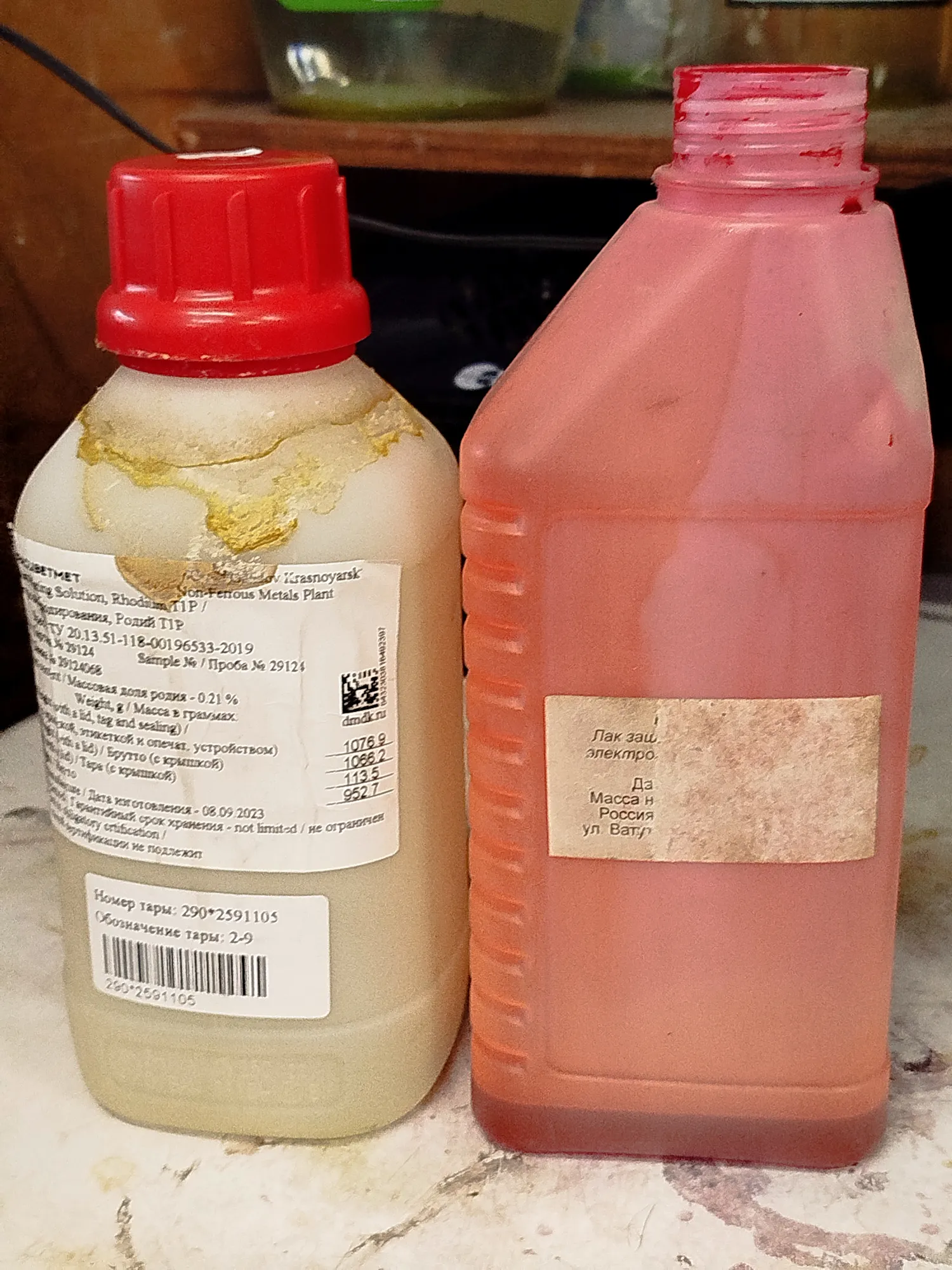 Самая левая колба- раствор родия, уже готовый продают. До этого мешала сама с тем же дистиллятом.