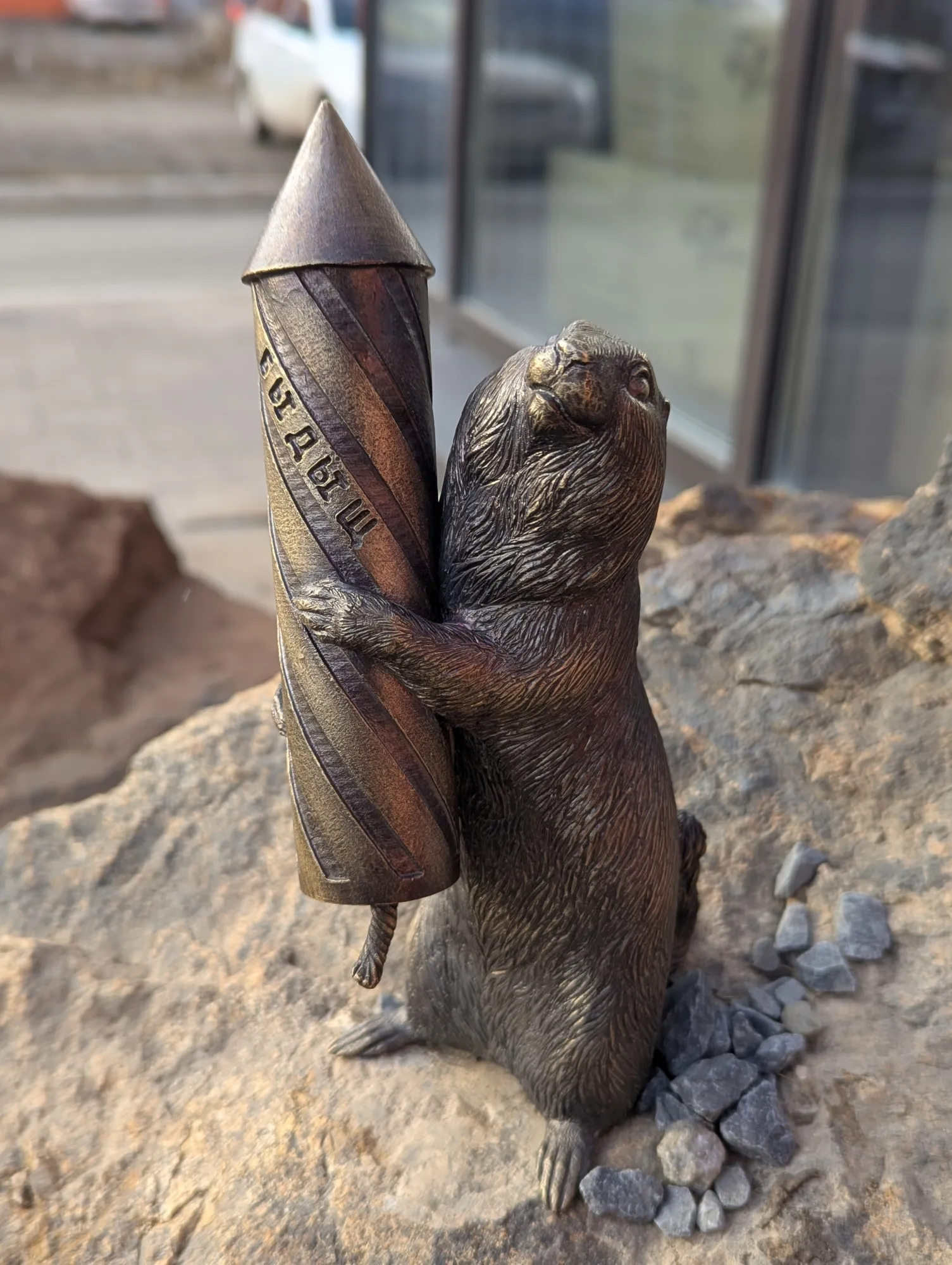 Знакомьтесь: это Вовчик. Его разместил владелец магазина пиротехники: «Вовчик любит праздники, звёздочки в небе и хорошее настроение. Он напоминает, как важно не забывать о маленьких радостях».